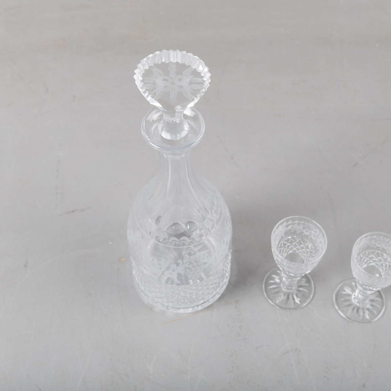 4222648. KARAFFE UND 2 COGNACGLÄSER, graviertes Glas.