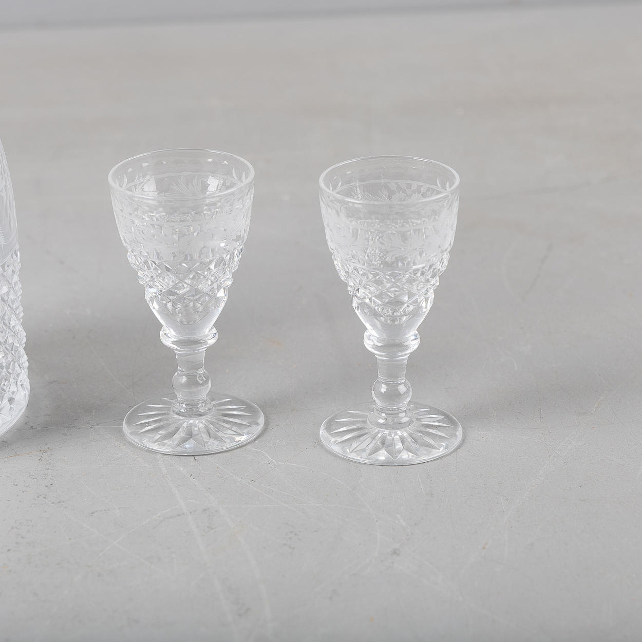 4222648. KARAFFE UND 2 COGNACGLÄSER, graviertes Glas.