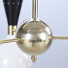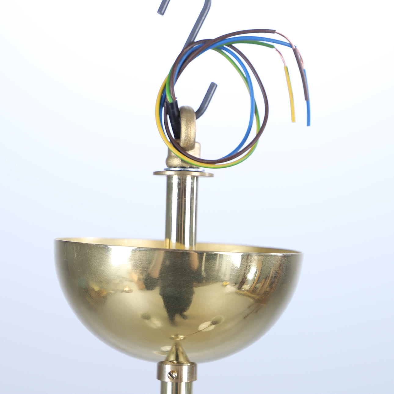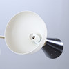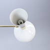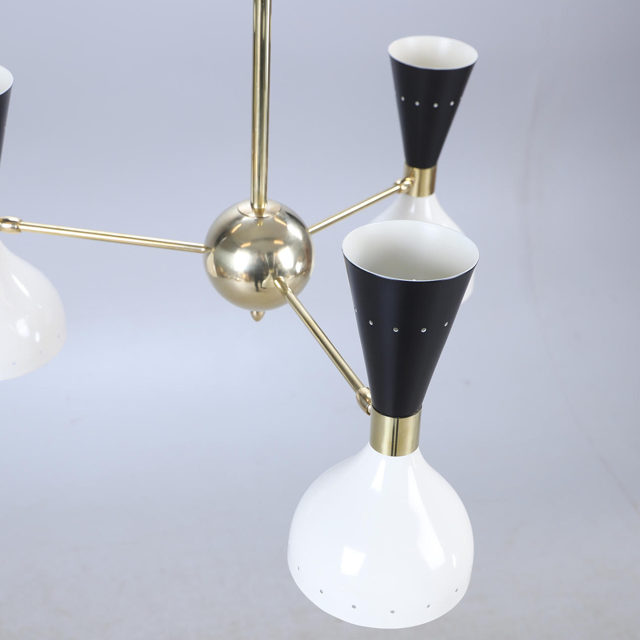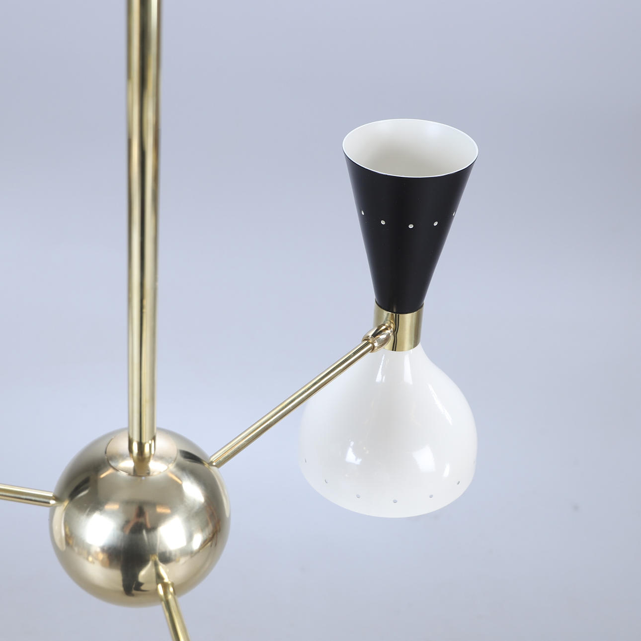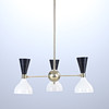Korpus aus patiniertem Messing, schwarz-weiß lackierte Metallschirme, 3 Leuchtenarme mit dualen Lichtquellen, E14