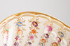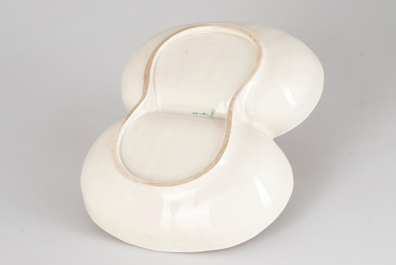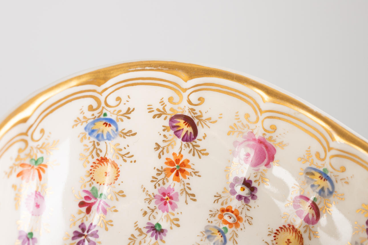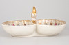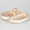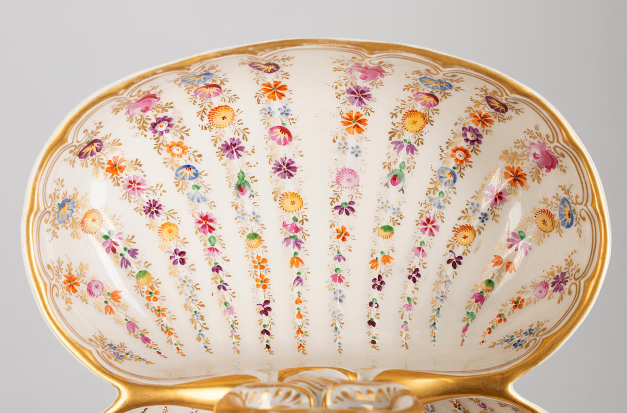 Weißporzellan mit polychromer Aufglasurbemalung und Goldstaffagen. Zwei gegenständige, muschelförmige Schalen auf entsprechenden Standring. Mittig rechteckiger Griff. Innen cremefarbener Fond. Auf den Graten gereihte Blüten. HxBxT: ca. 11 x 24 x 20 cm. Firmenblindstempel und Zeptermarke in Grün.