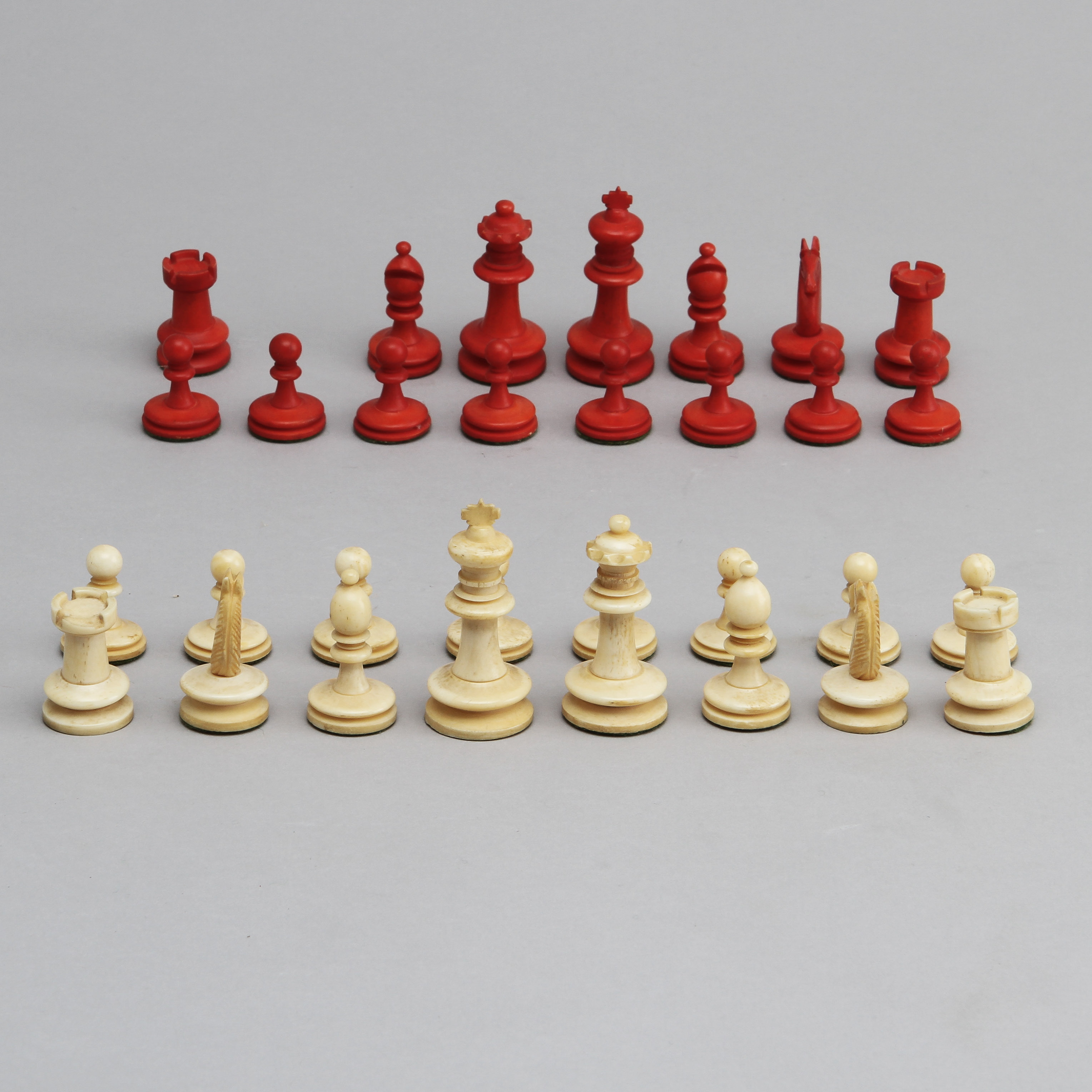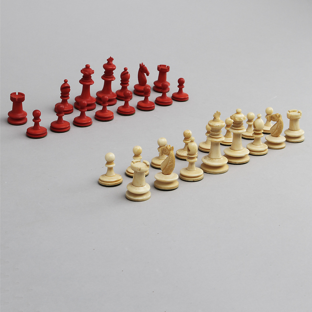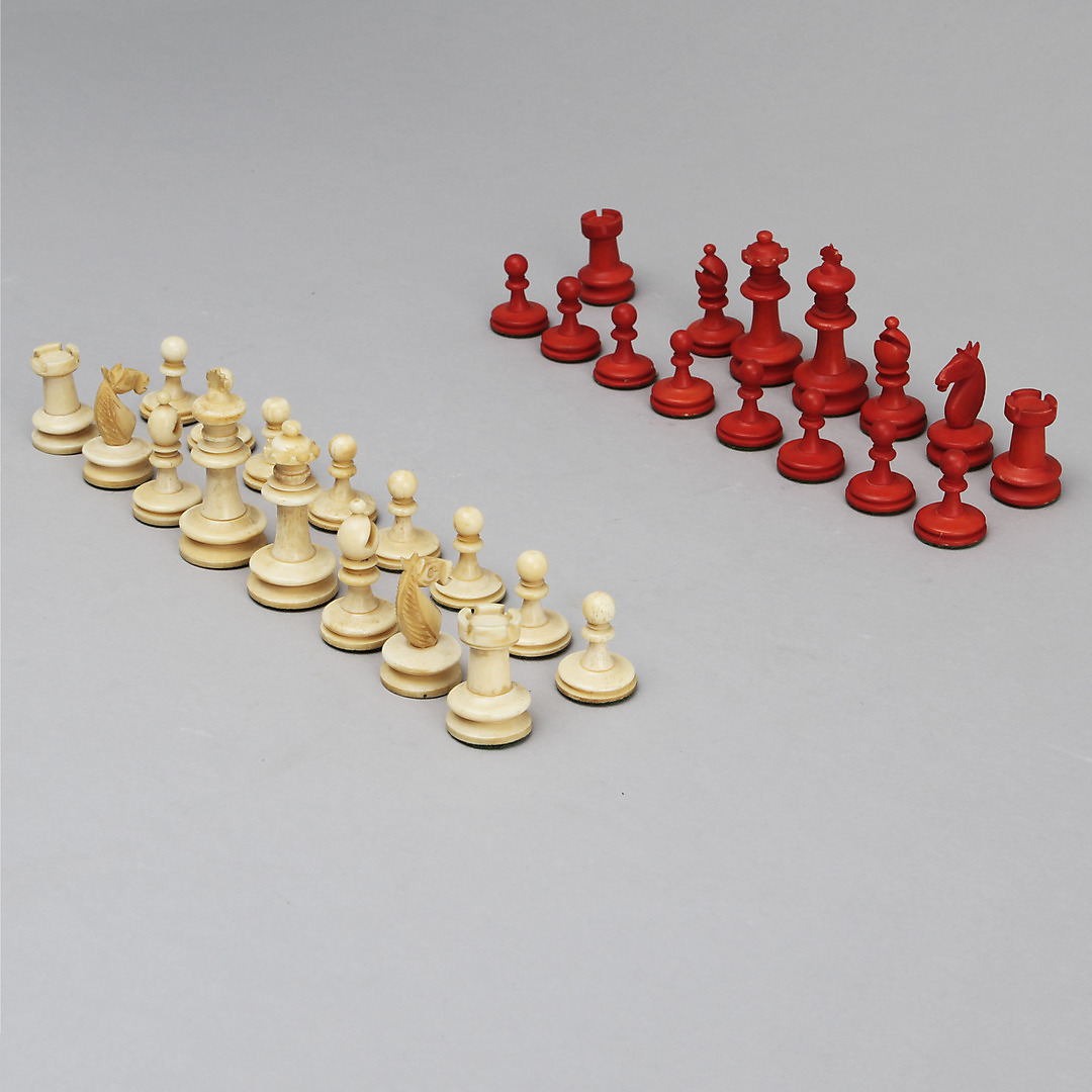 423020. SCHACHFIGUREN, 31 Stück, Knochen, 19. Jh..