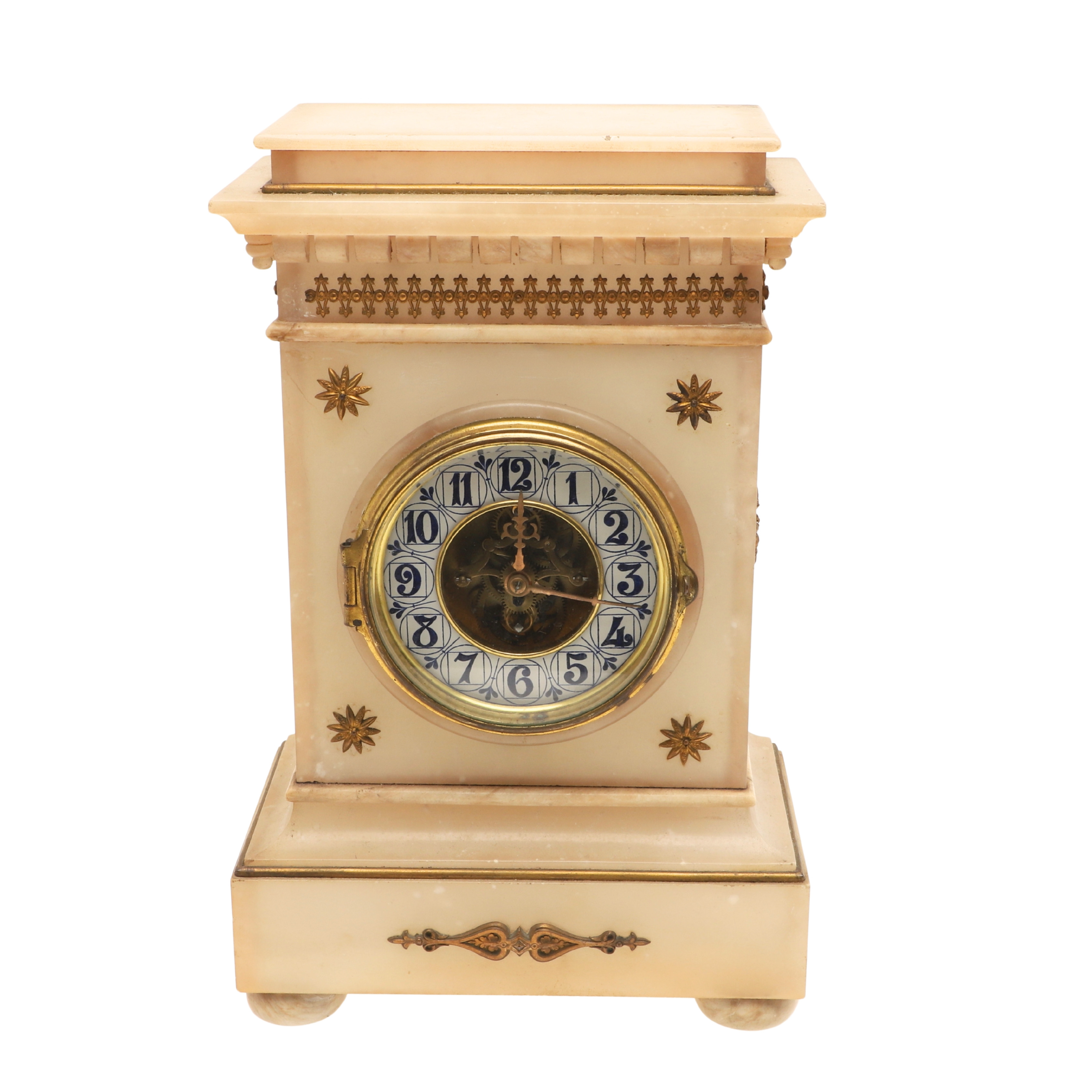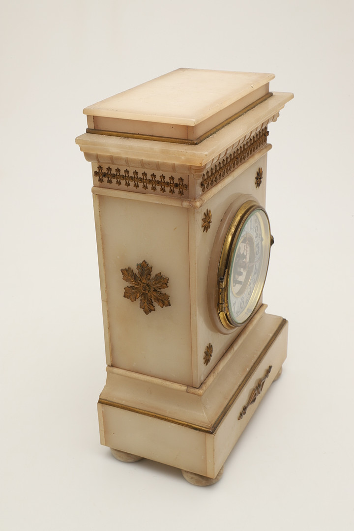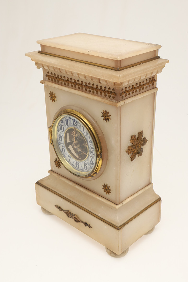 4233961. EINE FRANZÖSISCHE KAMINUHR IM ALABASTERGEHÄUSE.