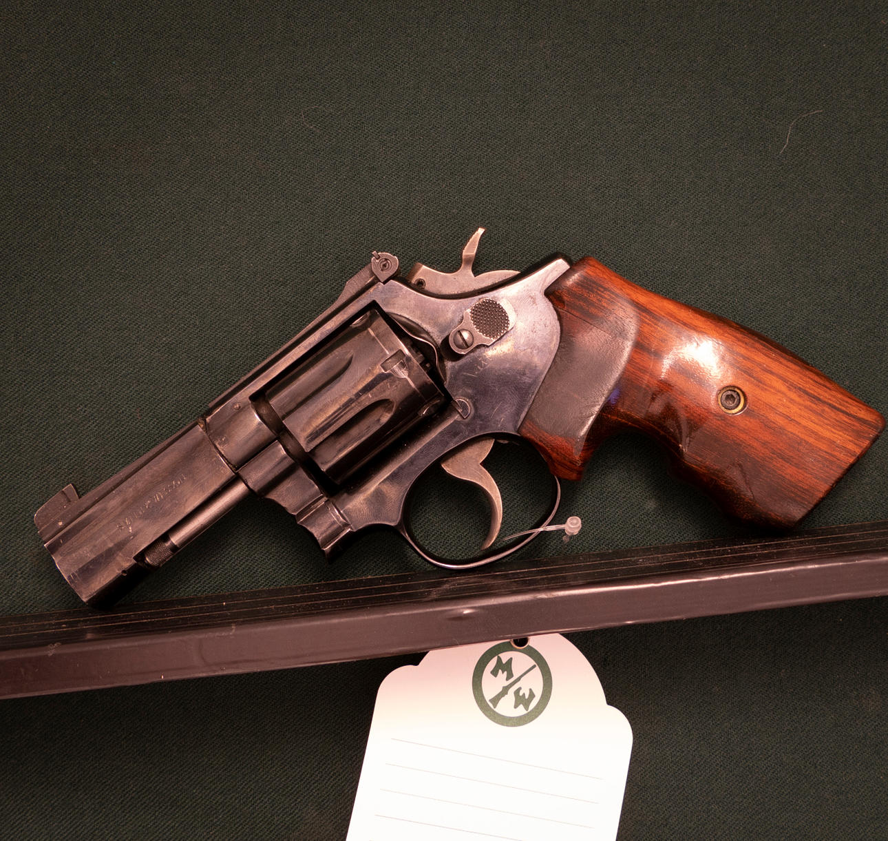 Revolver amerikanischer Marke Smith&Wesson Modell 15-3. Kaliber 38 Special. Zusätzliche Nr. 6K98157. Länge des Auslaufs 7,5 cm. Einstellbares Visier. Griffförmige Kolbenseiten aus Holz.