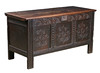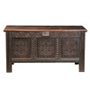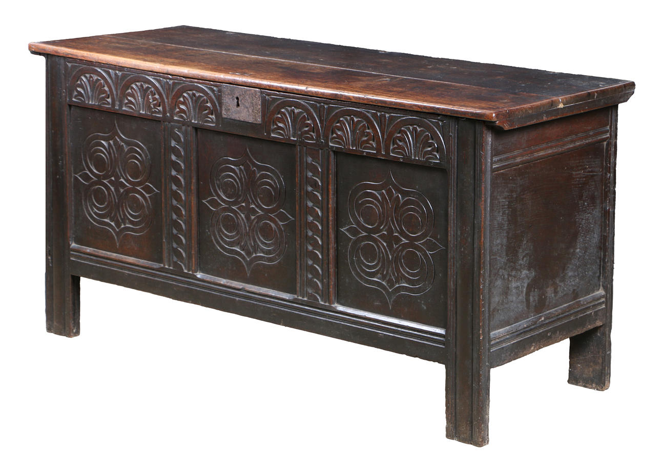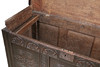 Die aufklappbare rechteckige Oberseite über einem geschnitzten Blatt- und Bogenfries mit drei versunkenen Paneelen, die jeweils mit einem Rollmuster geschnitzt sind, 144 cm breit, 58 cm tief, 77 cm hoch.