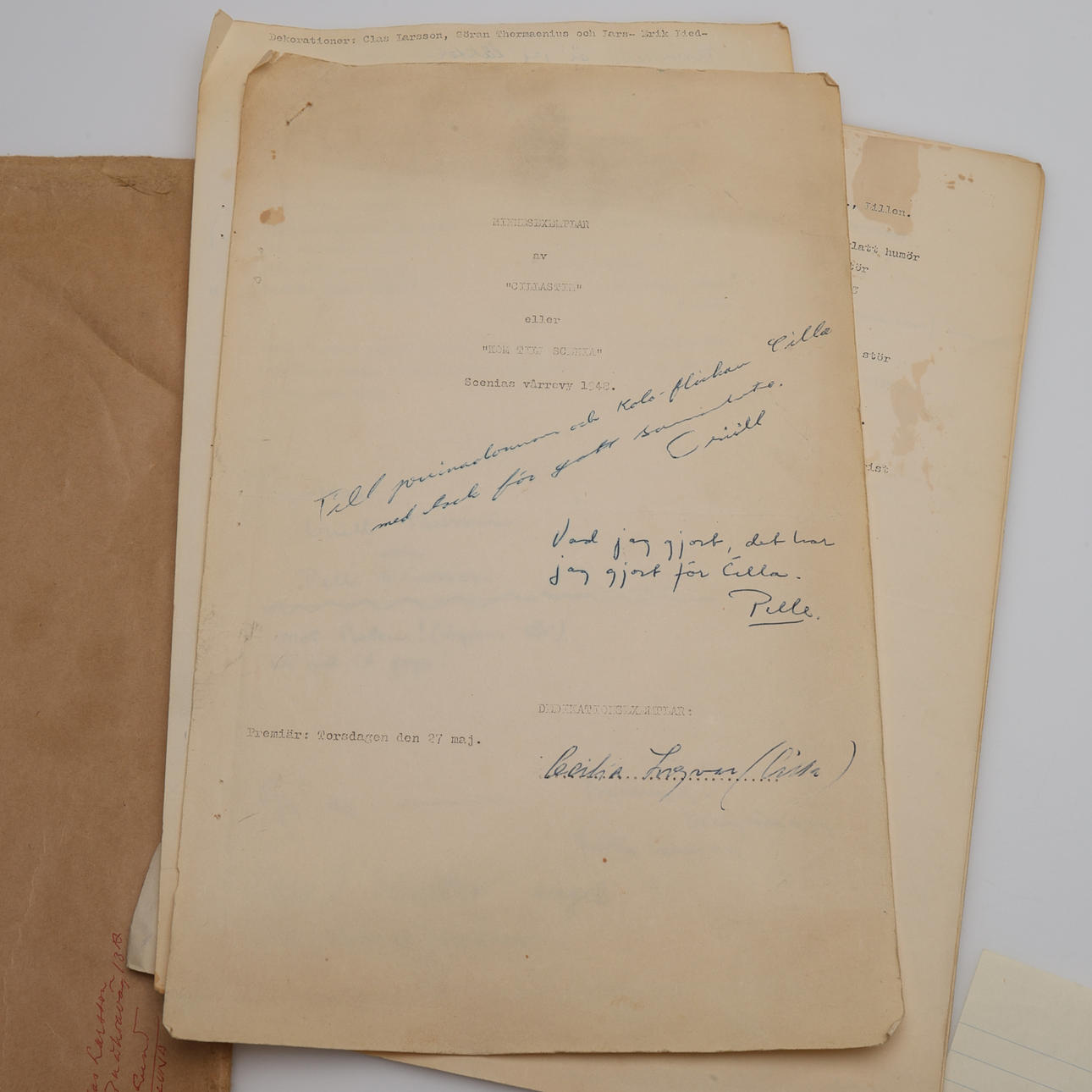 Gedenkkopie von „Cillastim“ oder „Come to Scania“, der Frühjahrsrevue 1948 von Scenia. Widmungsexemplar an Cilla Ingvar mit handschriftlichen Widmungen „An die Primadonna und das Kola-Mädchen Cilla mit Dank für die gute Zusammenarbeit. Crüll“ (Sven-Ingmar Fältström) und „Was ich getan habe, habe ich für Cilla getan. Clown“ (Pelle Ericsson). Mit handschriftlichen Ergänzungen und Anmerkungen.
