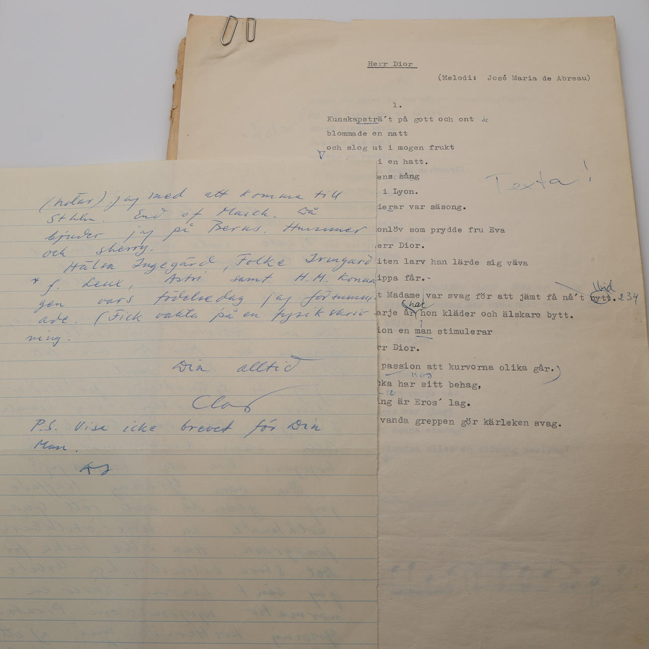 Sowie eine Kopie von Crülls Widmungsexemplar mit Briefen von Clas Larsson. Kopie des Artikels über Cilla Ingvar mit Bild von Sceniarevyn.