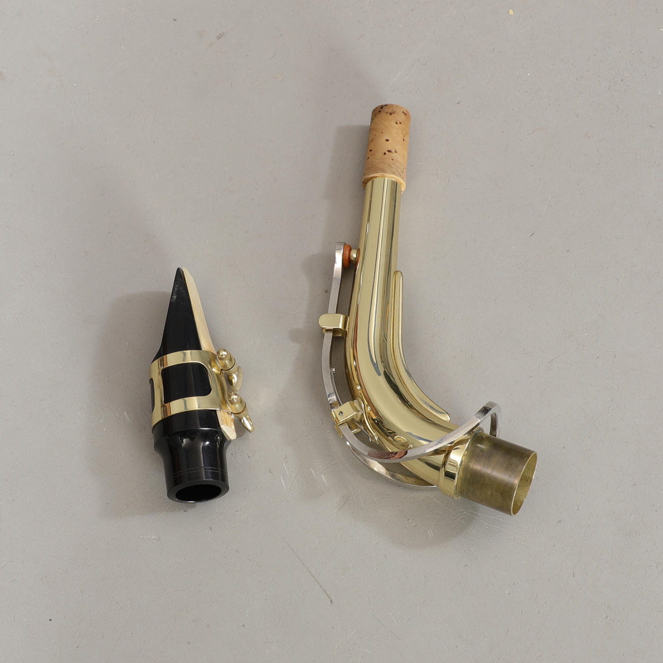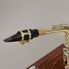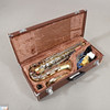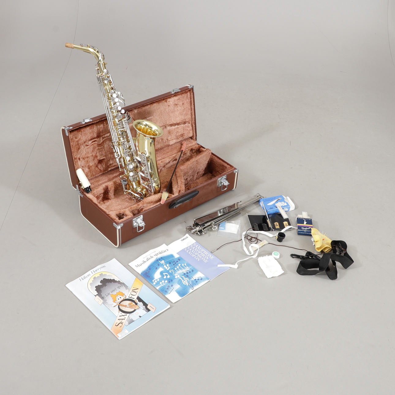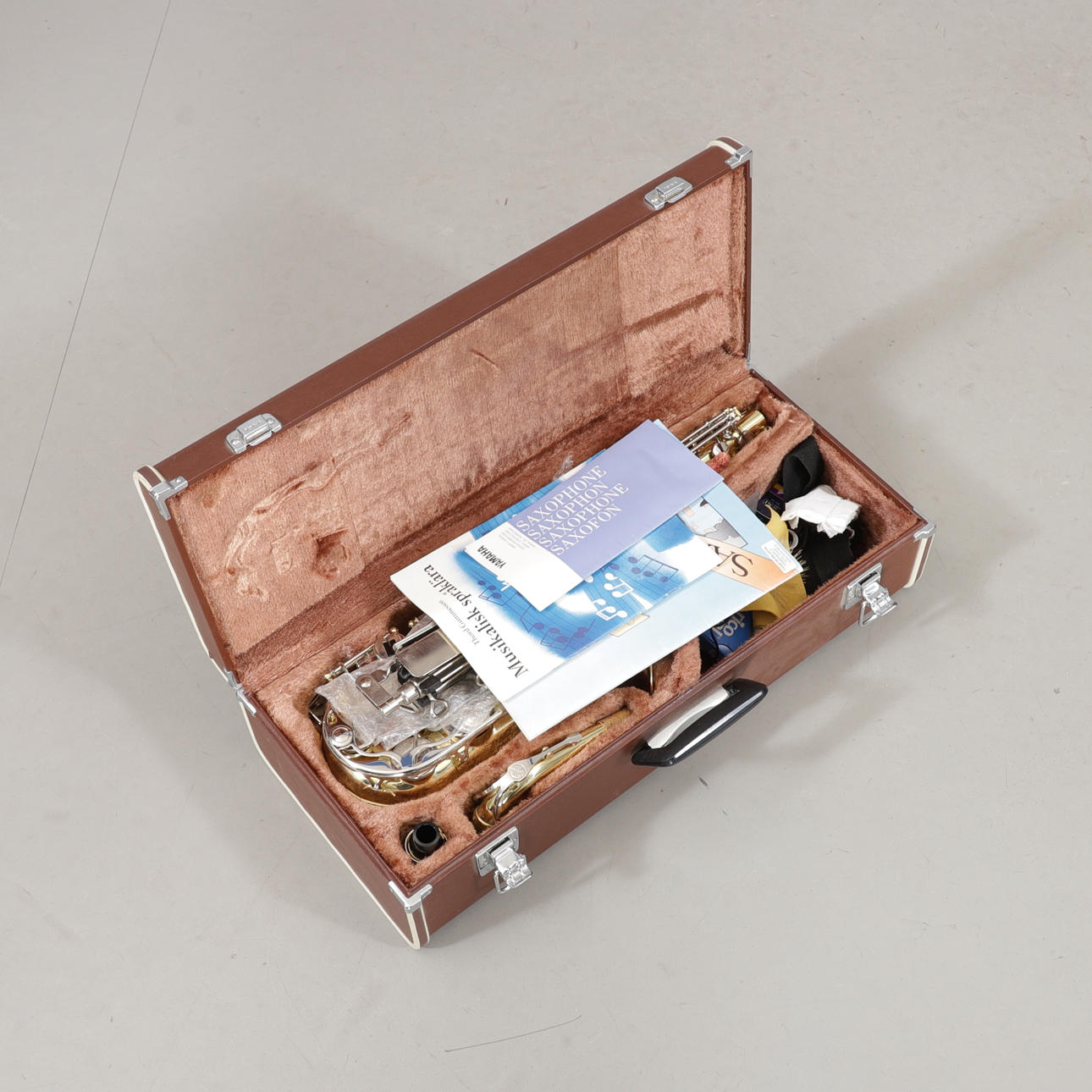Saxophon in Tasche mit Notenständer, Anleitungen und Zubehör.