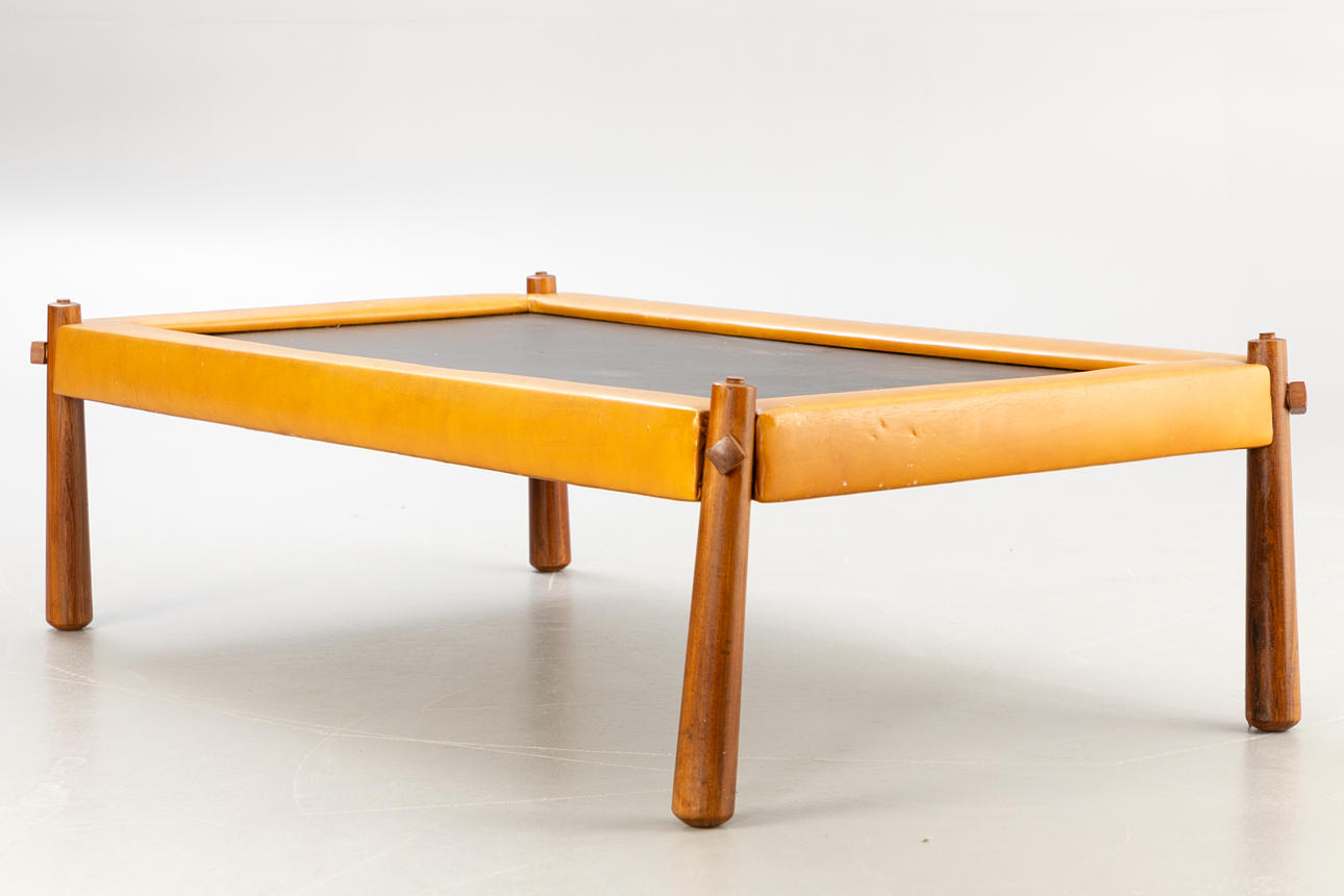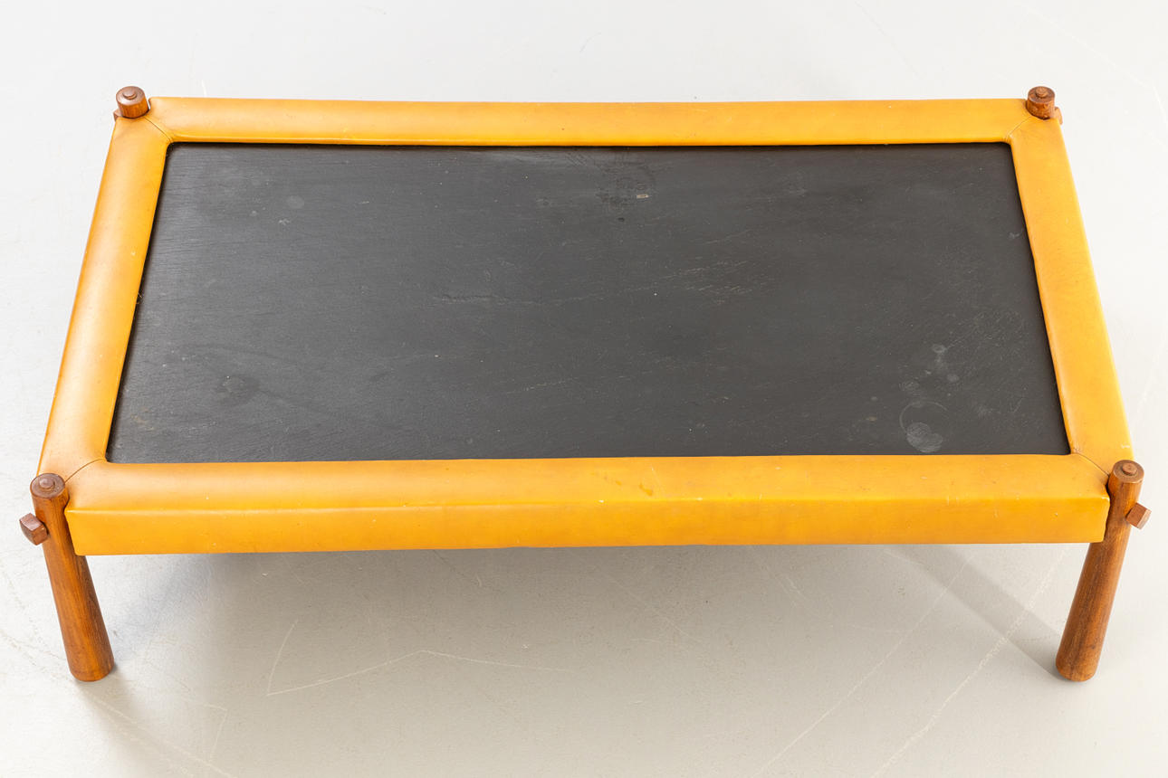 Coffee Table Modell MP 81 / Couchtisch von Percival Lafer. Brasilien, 1960er Jahre. Gestell aus Teakholz und Leder. Tischplatte aus Schiefer.