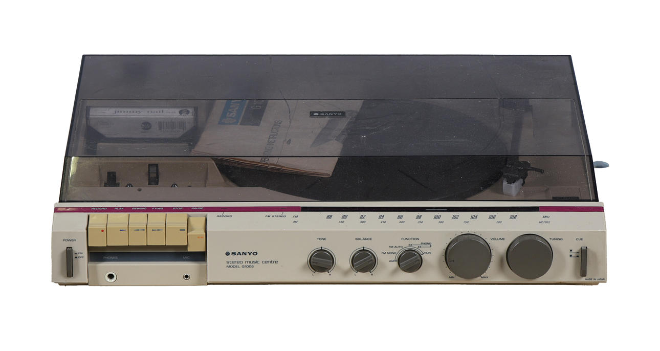 Dazu gehören ein Sony PS-LX56 (s/n YA6709173), zwei Bush MTT1 (einer in Schwarz und einer in Silber) und ein Sanyo G1005 Stereo Music Center (s/n 1521180083). (4).