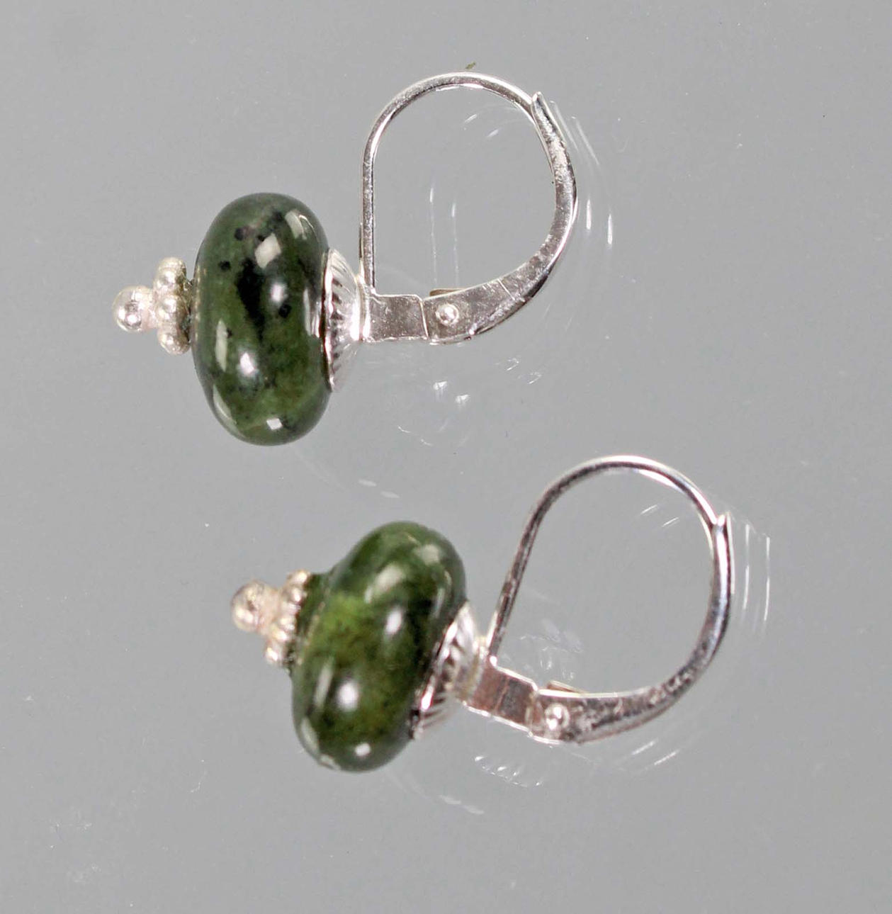 Jade Ohrringe in Silber 925 gearbeitet, polierte Jade mit verzierten Abschluss, Länge 17 mm, Durchmesser 10 mm, Gewicht 2,9 Gramm.