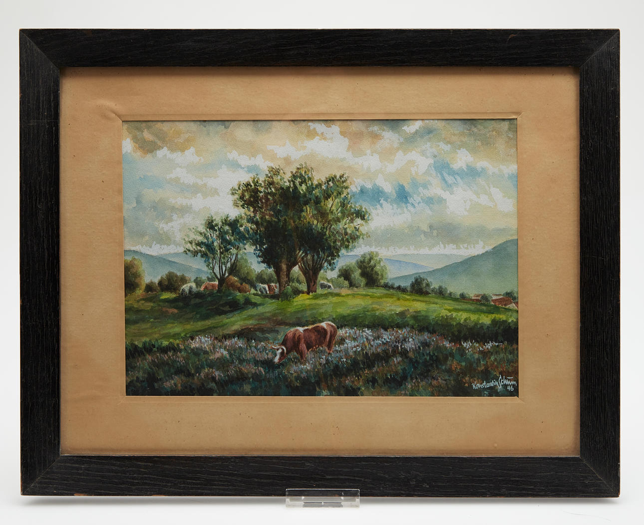 Konstantin Schum, Weidelandschaft mit Kühen, Aquarell auf Papier, 22,5 cm x 32,5 cm Sichtmaß, 38 cm x 49 cm Rahmenmaß, signiert, 46 datiert.