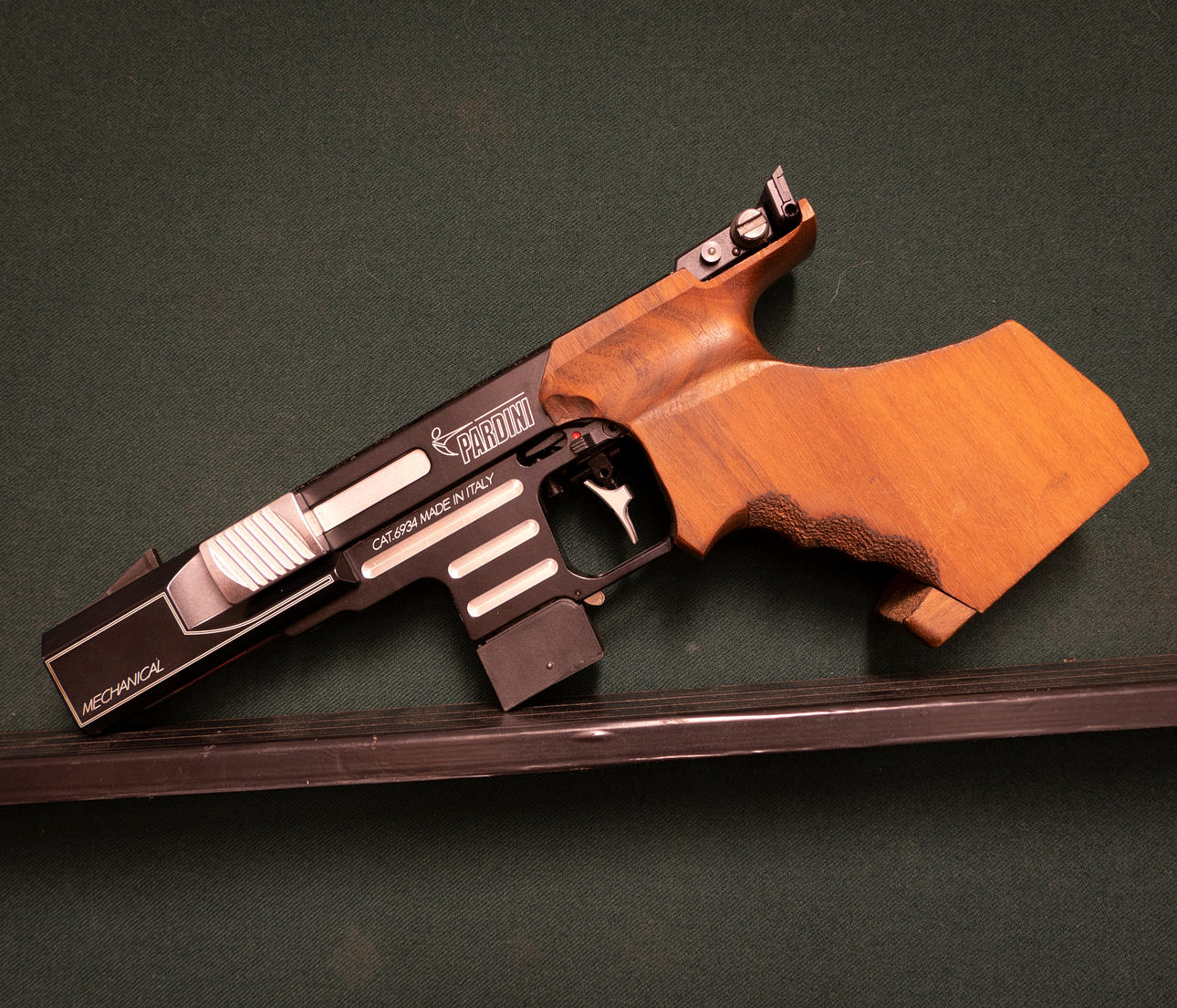 Pistole, italienische halbautomatische Marke, Modell Pardini. HP Kaliber 32wc bis Nr. A2852. Einstellbares Visier. Herausnehmbares Magazin. Anatomischer Kolben mit verstellbarer Handstütze (groß). Originalverpackung mit zusätzlichem Magazin und Zubehör im Lieferumfang enthalten.