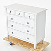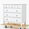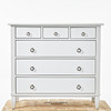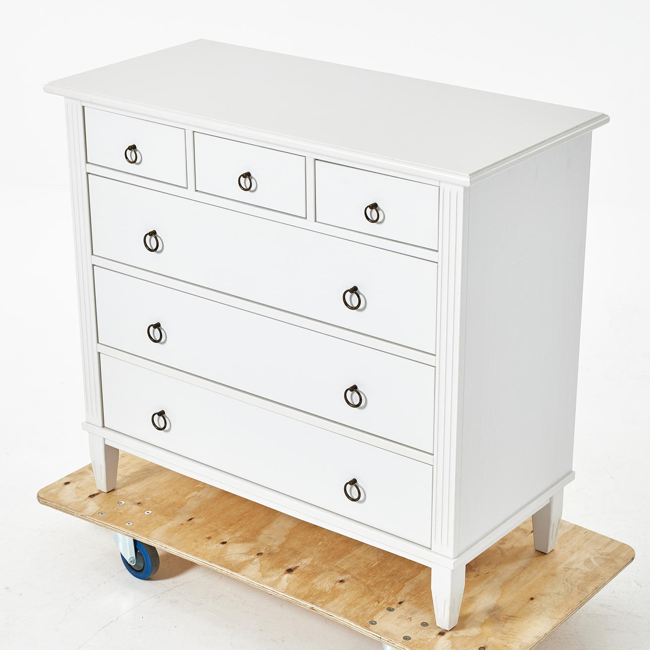 Weiß lackierter Rahmen aus Holz und MDF, 9 Schubladen, Beschläge aus gelbem Metall, Höhe ca. 93, Länge 102, Tiefe 48 cm.