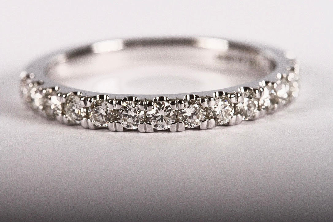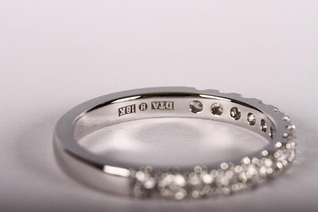 Besetzt mit 15 Diamanten im Brillantschliff von insgesamt ca. 0,48 ct Wesselton-Top Wesselton/VS-SI, Gewicht 2,8 Gramm, Größe 52.