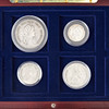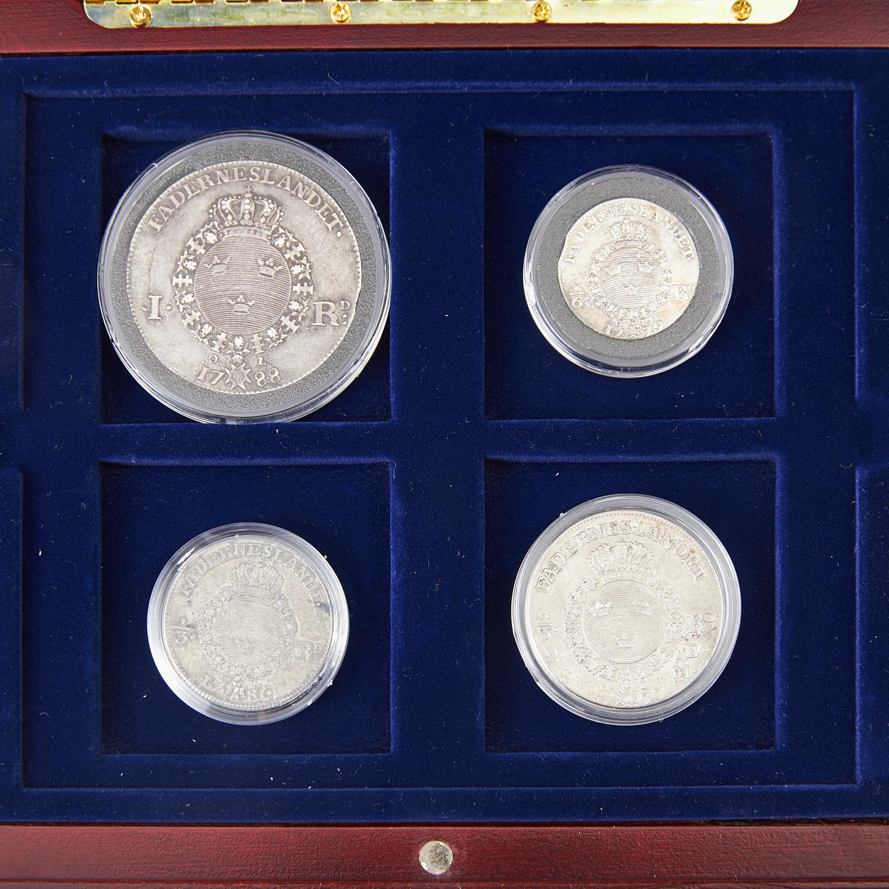 Bestehend aus: 1 Riksdaler 1788, 2/3 Riksdaler 1777, 1/3 1786, 1/6 Riksdaler 1779, im Karton, Durchmesser 26-41 mm, Gewicht ca. 6-39 g.