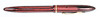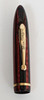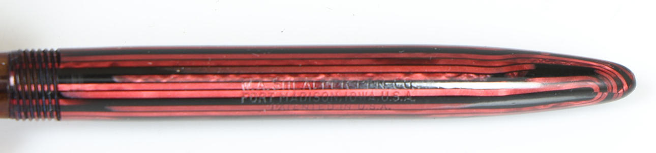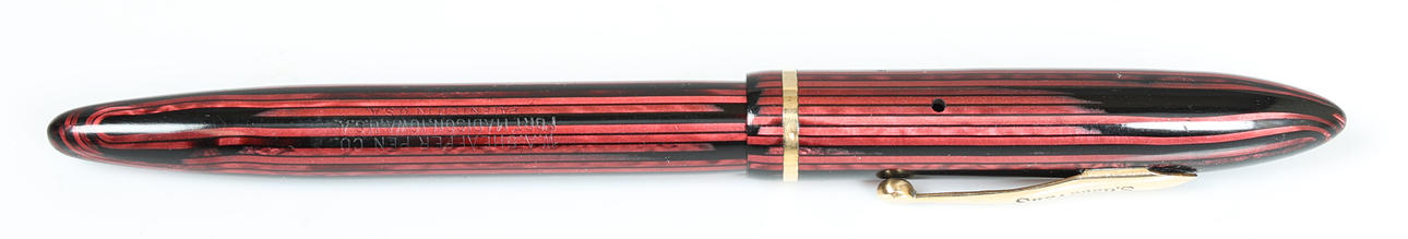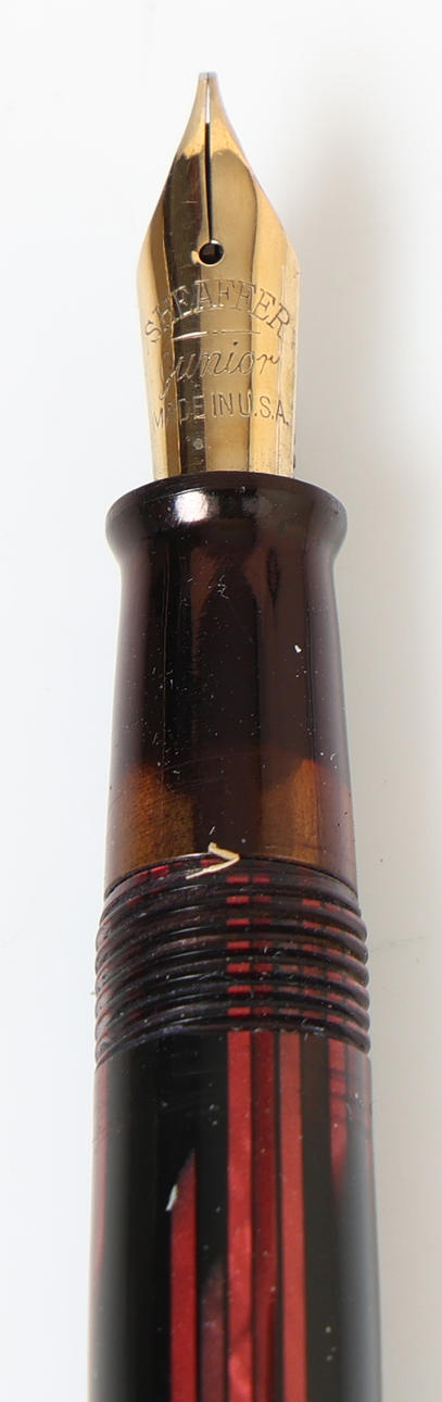 Waage in voller Größe mit rotem und schwarzem gestreiftem Schaft, goldfarbenem Rand, Taschenclip mit Aufdruck „Sheaffers“, goldenem Band an der Kappe, Barrel mit Aufdruck „W.A. Sheaffer Pen Company Fort Maddison, Iowa, USA Patentiert in den USA. 'Mit Tintensichtbereich auf der Spitze, auf der Feder steht „Sheaffer Junior Made in U.S.A.“, 13,8 cm lang.