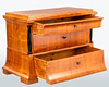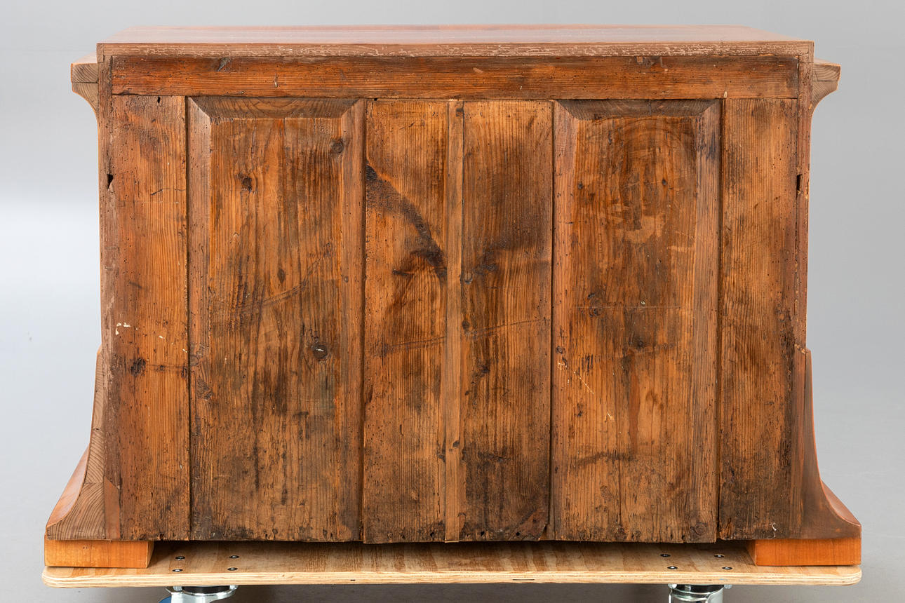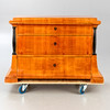 Apfel auf Nadelholz furniert. Die Lisenen des rechteckigen Korpus, als Postamente für die vorgesetzten, ebonisierten Säulen, ausgezogen. Die Front durch drei Schubladen in variierenden Größen gegliedert und mit Schinkel Giebel abschließend. HxBxT: ca. 79 x 109 x 56 cm.