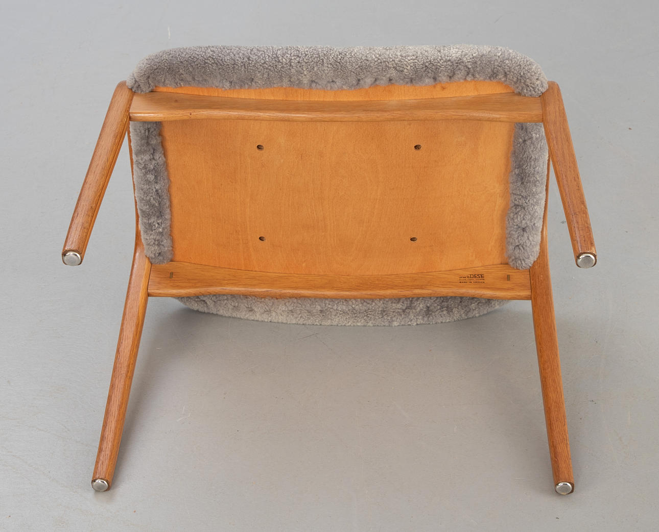 Entwurf 1956. Gestell aus Eiche. Bezug aus grauem Plüschatoff (nicht original), mit Brandstempel bezeichnet.