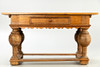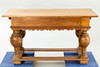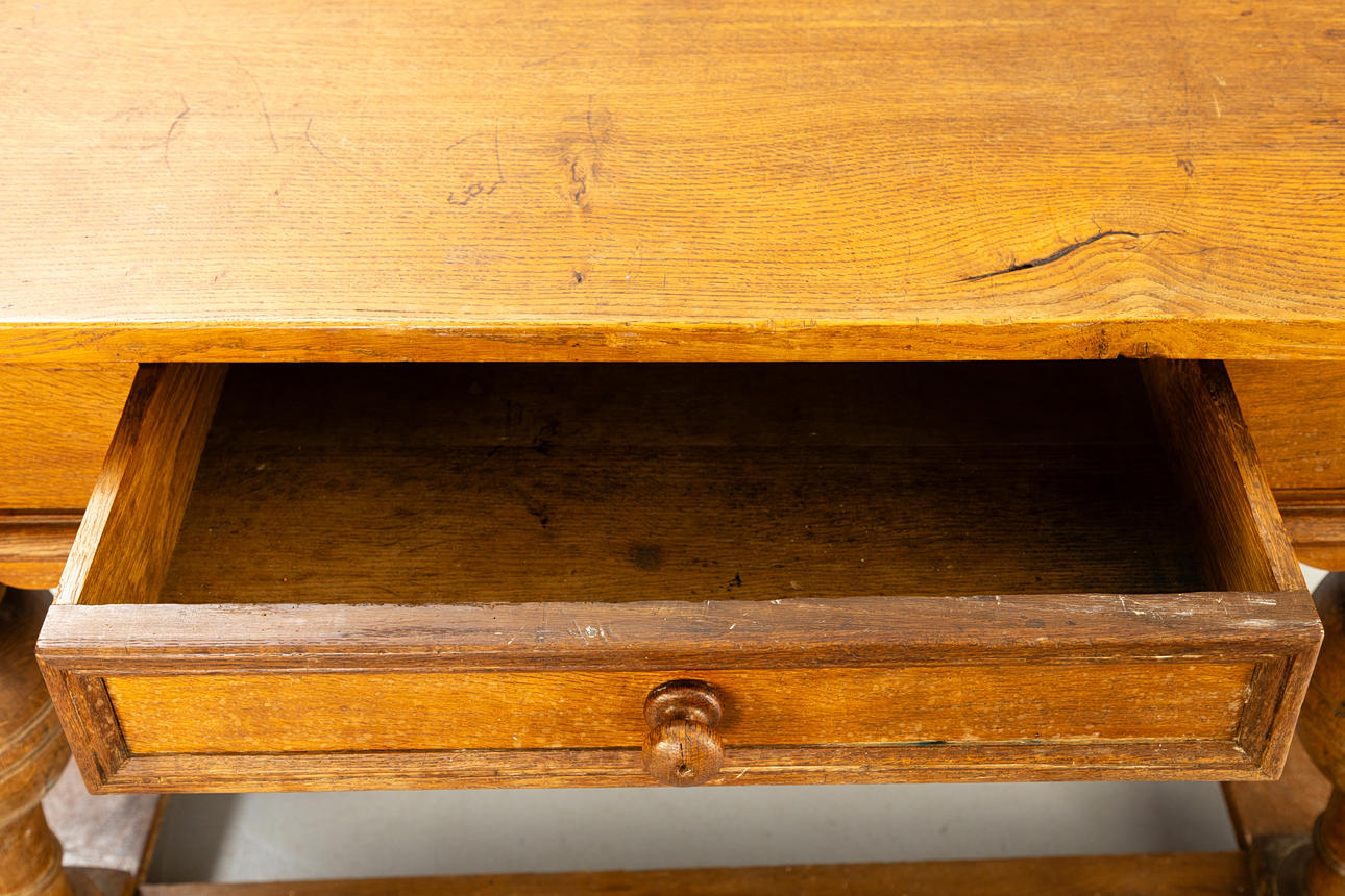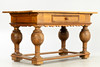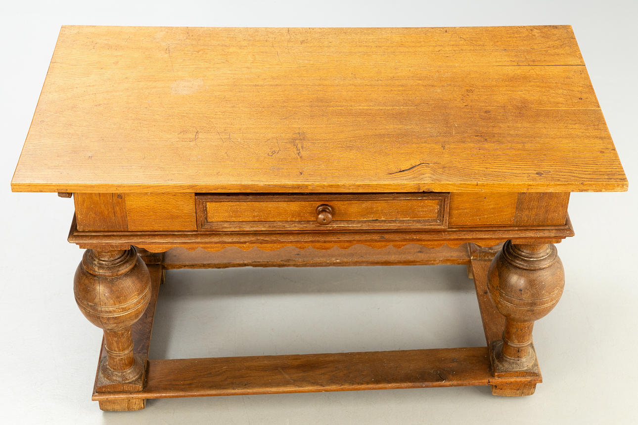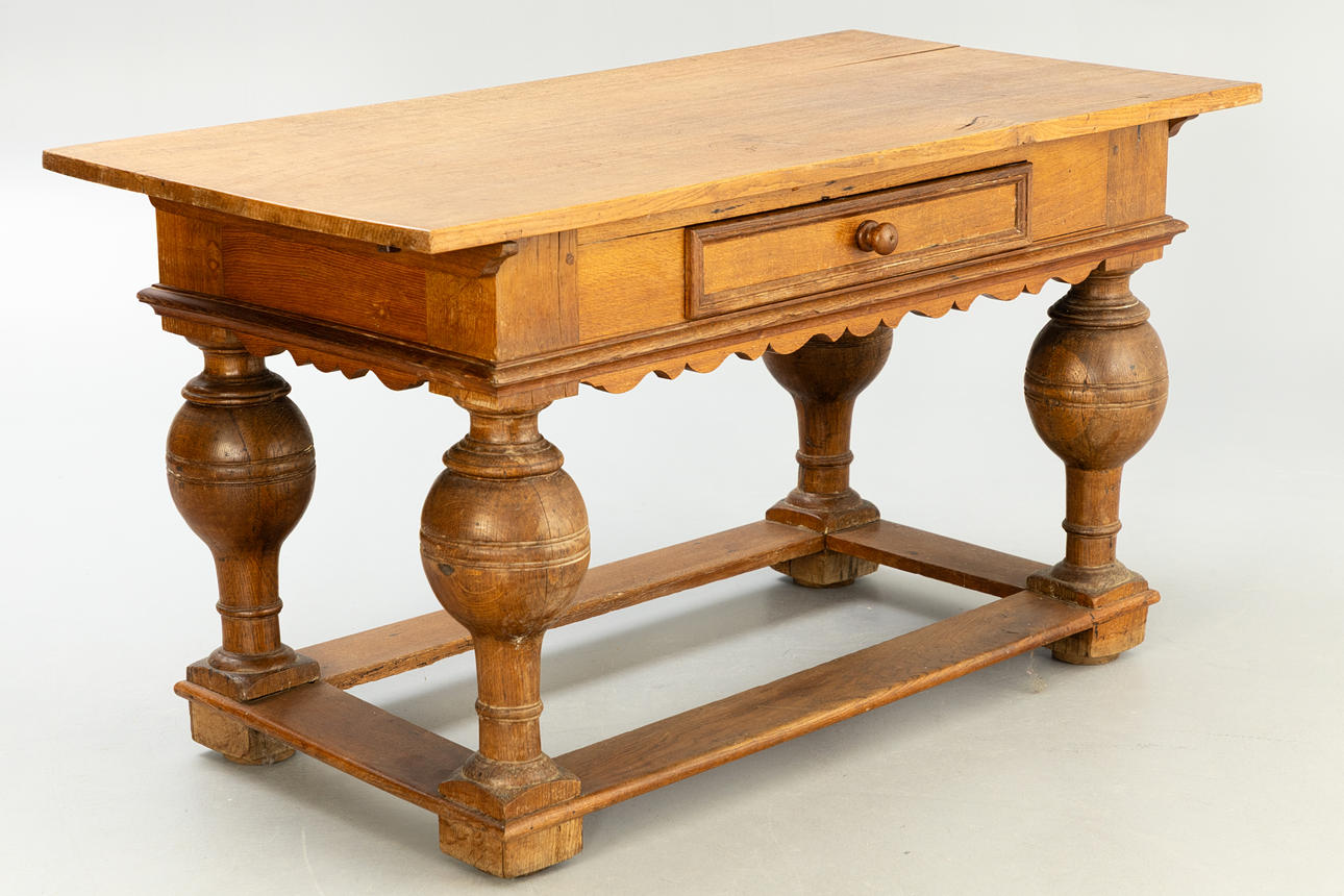 Eiche. Vierseitige, flache Streben auf vier Blockfüßen. Gegliederte Beine mit massiven Kugelungen. Gebogt ausgeschnittene Kante unter dem breiten Zargenkasten. Schauseitig einfacher Schub. Überstehende Tischplatte. HxBxT: ca. 80x141 x 75 cm.