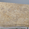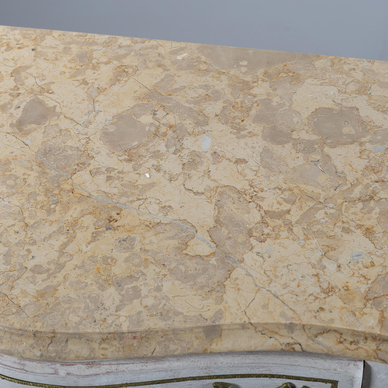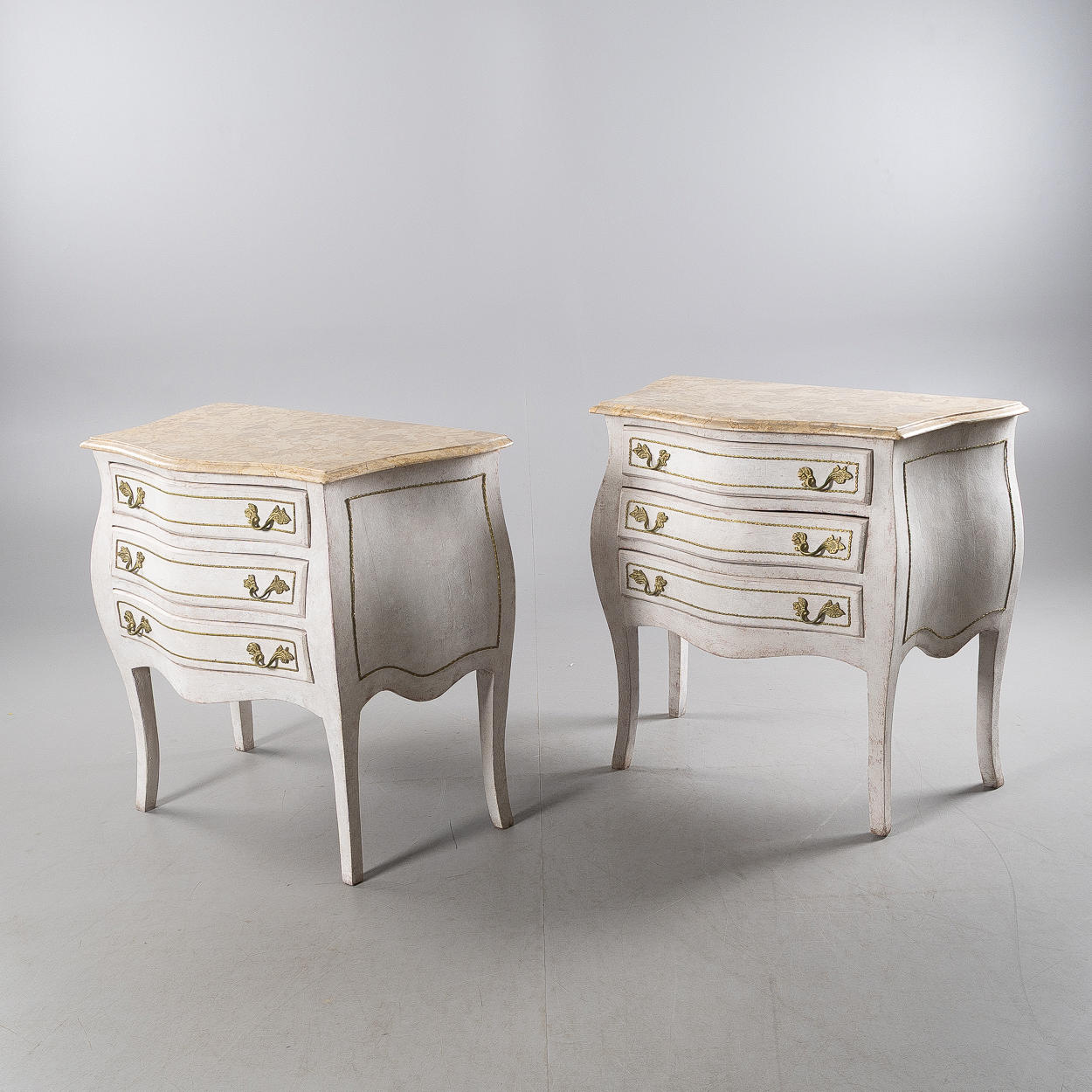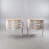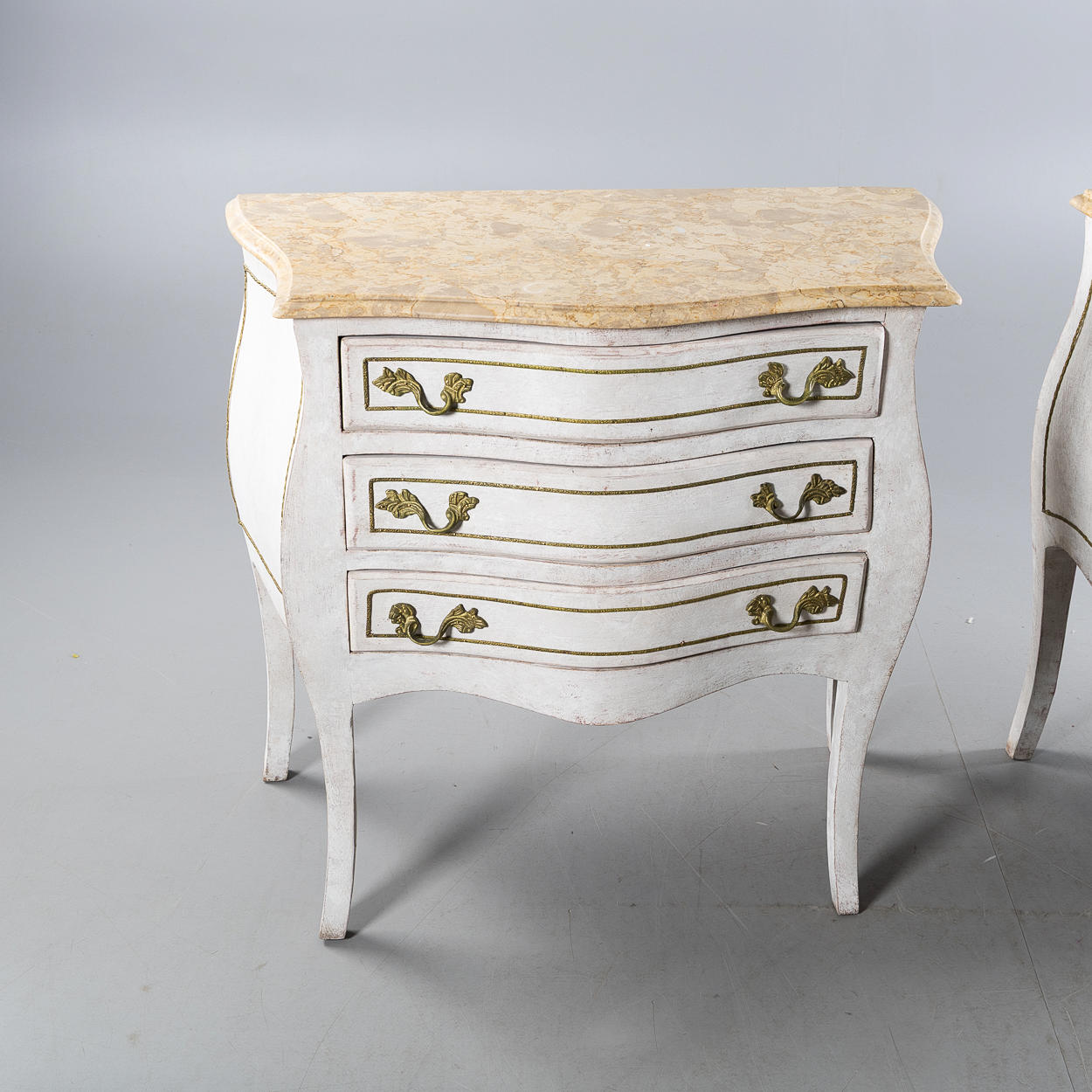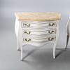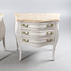 jeweils 3 Schubladen, Arbeitsplatten aus Marmor, Listendekor und Griffe aus gelbem Metall, Höhen ca. 77, 83x45 cm.