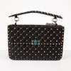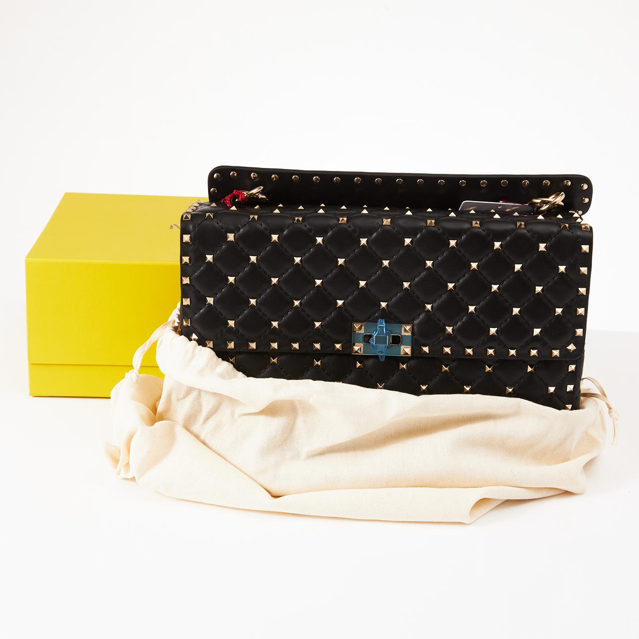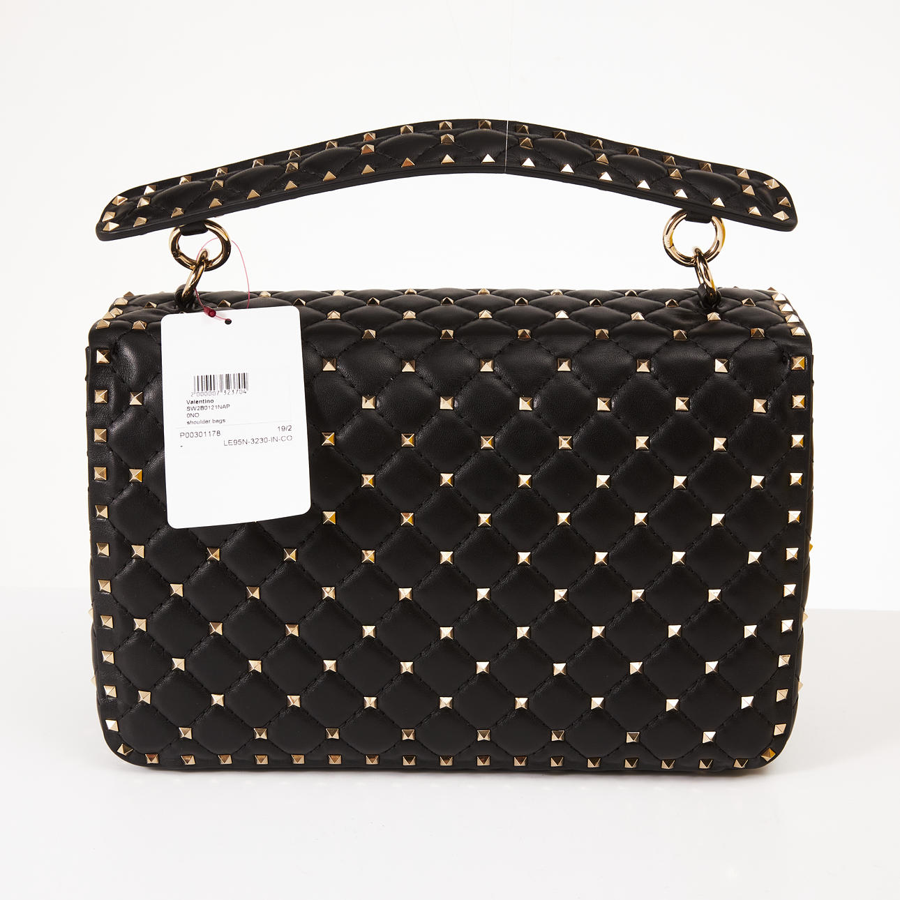 Aus schwarzem Nappaleder, gesteppt mit passenden Stricken und oxidierten Nieten, oberes Lenkermodell mit abnehmbarem Griff und Kette, mit schwarzem Leder gefüttert, innen mit drei Taschen, eine mit Reißverschluss, Aufschrift „Valentino Garavani“, inklusive Staubbeutel, zusätzliche Nieten und kein Originalkarton, Maße ca. 31 x 20 x 10 cm.