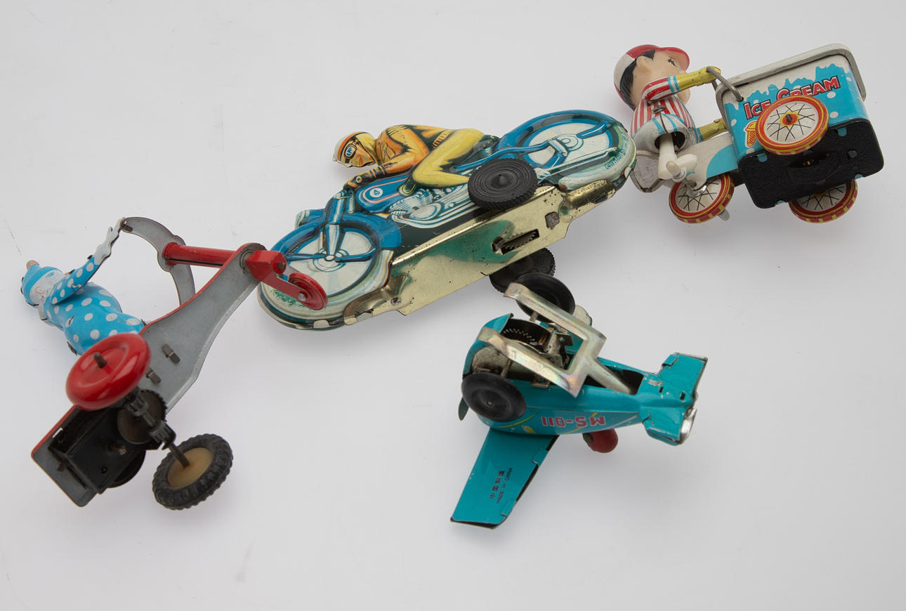 Blech, lithographiert und lackiert., teilweise Antriebsmodelle und Modelle mit Schlüsselaufzug (alle Schlüssel fehlen). In verschiedenen Ausführungen, u.a. Ente MS 042, MS405 Blech-Eiswagen, Motorradfahrer PN-Cord, Schwungantrieb, Deutschland, 1960/70er Jahre. "Training Plane", Ente Lehmann PAAK-PAAK 903, Vogel Stieglitz. Clown auf rotem Roller, Lemezarugyar, TT Takatoku Toys- VW Käfer.