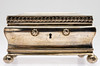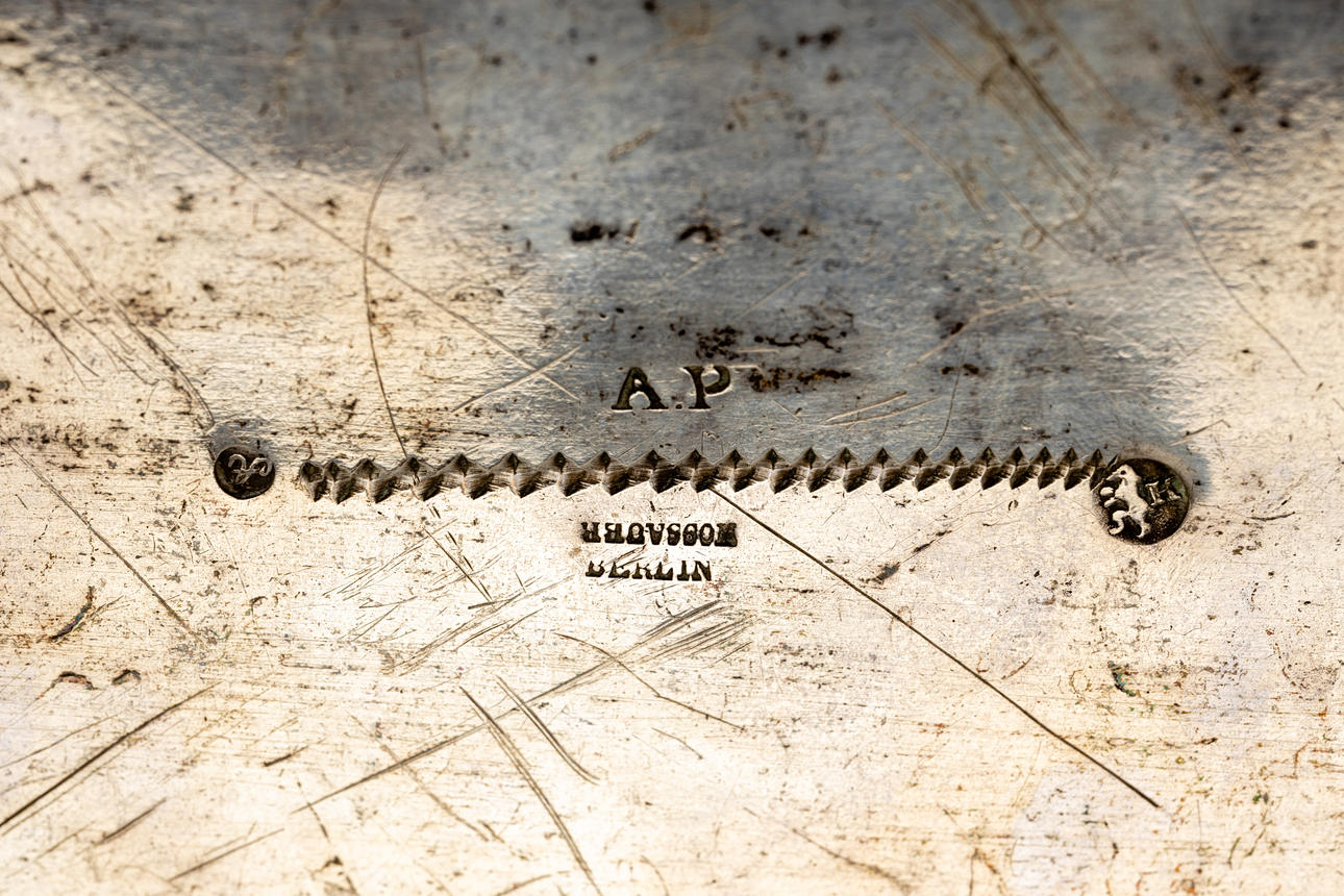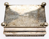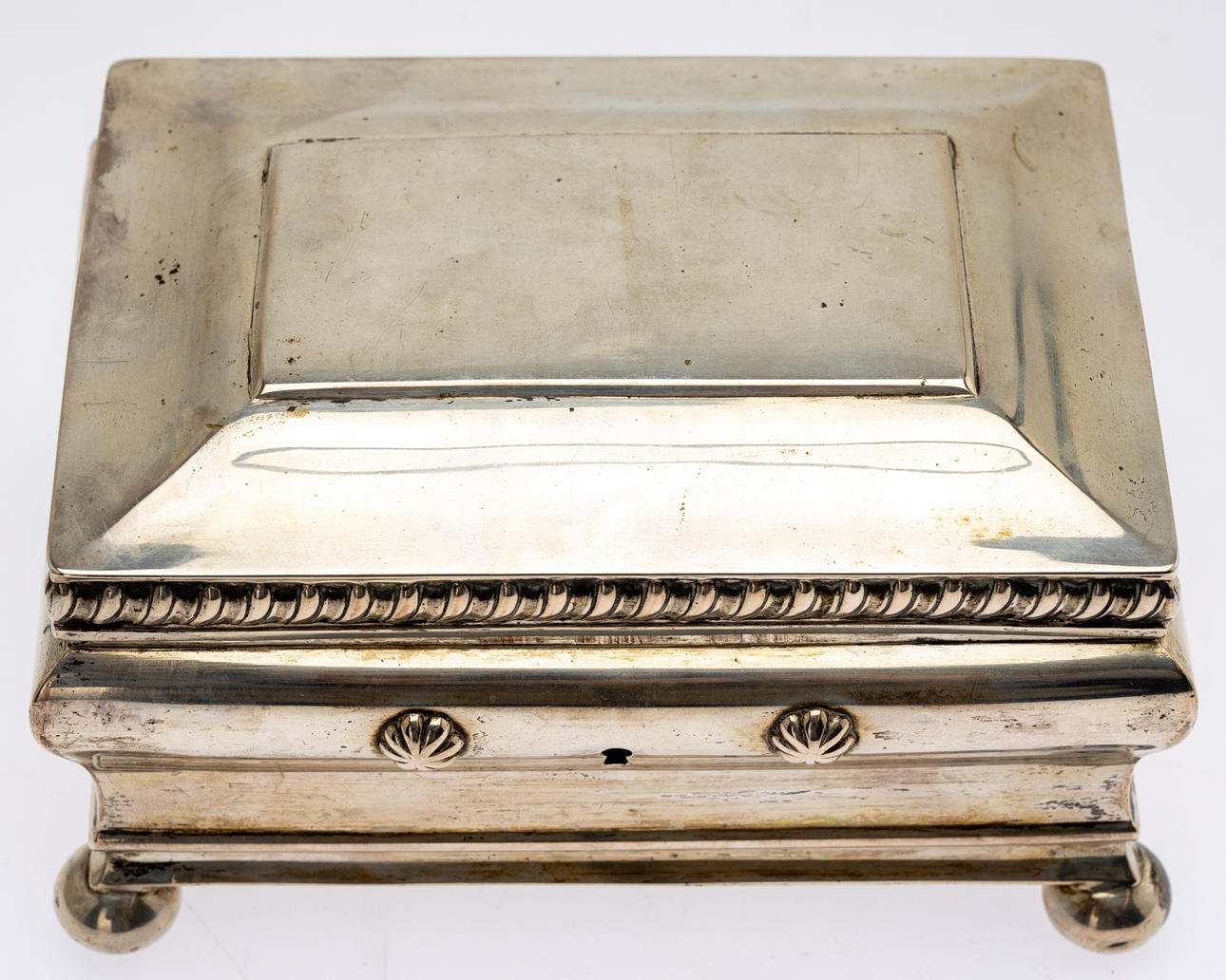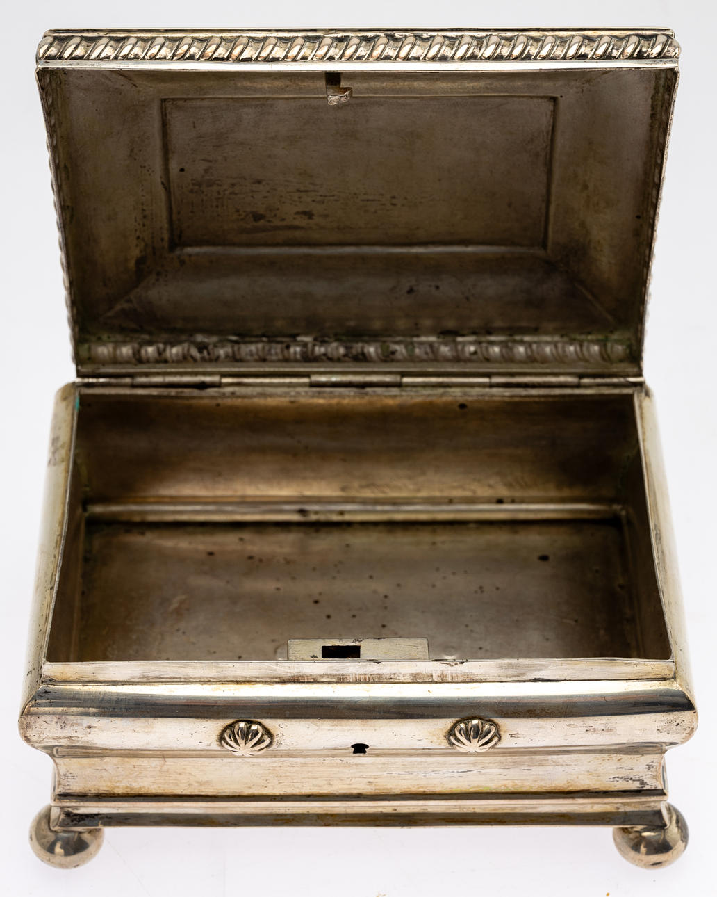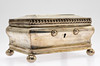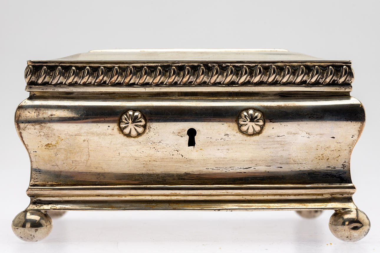 Silber, getrieben und gedrückt. Rechteckiger, bombierter Korpus auf Kugelfüßen. Umlaufendes Kordelband auf dem Rand des leicht gewölbten Deckels. Meisterzeichen: Hossauer. Stadtmarke mit "K", Beschauzeichen des J. C. S. Kessner (1819-1854), zweite Beschau "A", B. G. F. Andreack (1819-1842) und ein Tremolierstrich.