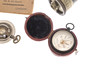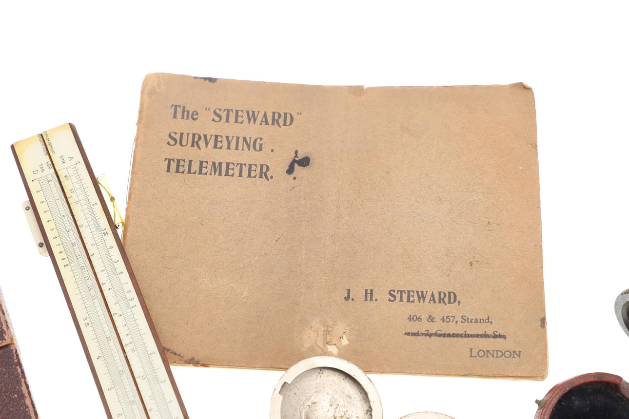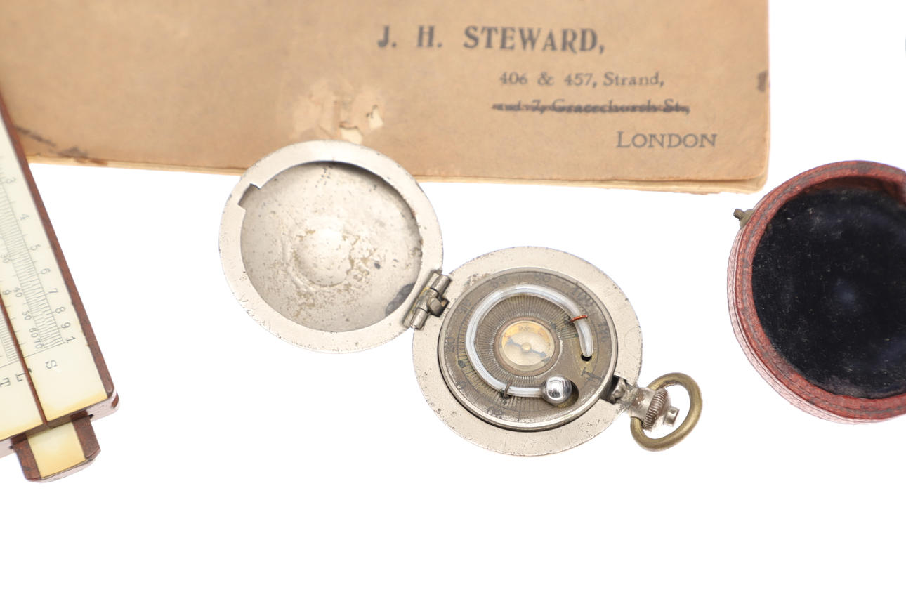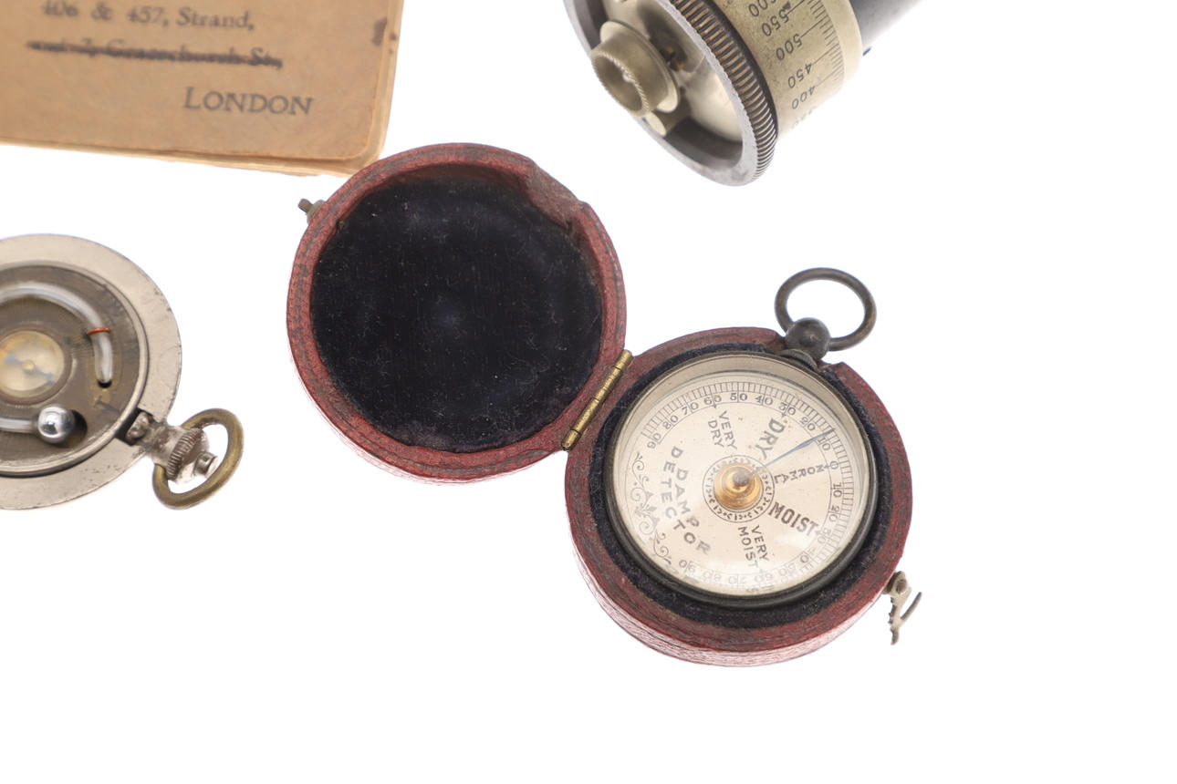 Ein Feuchtigkeitsmelder in weißem Metallgehäuse und rotem Lederreisetui, 4,5 cm. Ein Thermometer und ein Kompass in einem Gehäuse im Taschenuhr-Stil, ein Rechenschieber und ein „Steward“ -Vermessungsmesser mit Anweisungen. 4 Artikel.