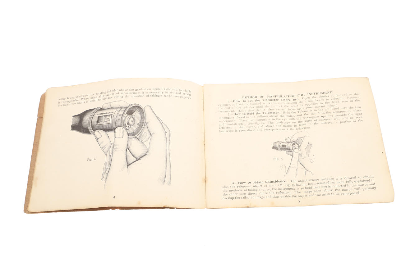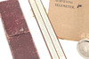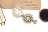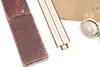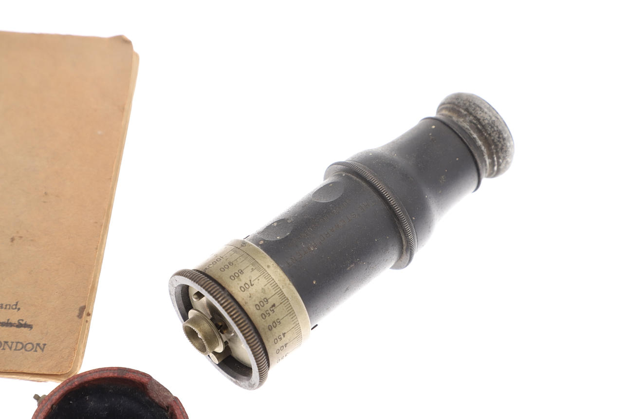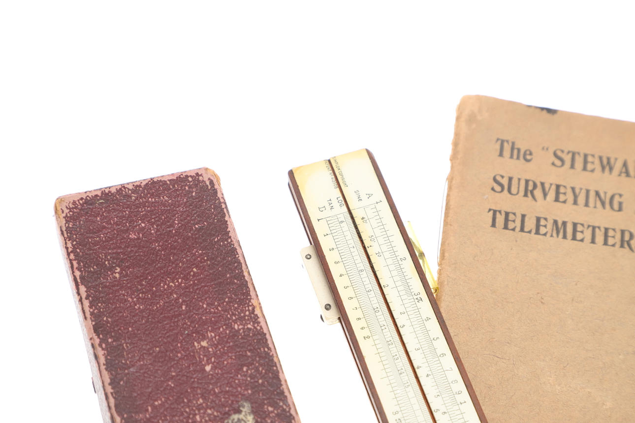 Ein Feuchtigkeitsmelder in weißem Metallgehäuse und rotem Lederreisetui, 4,5 cm. Ein Thermometer und ein Kompass in einem Gehäuse im Taschenuhr-Stil, ein Rechenschieber und ein „Steward“ -Vermessungsmesser mit Anweisungen. 4 Artikel.