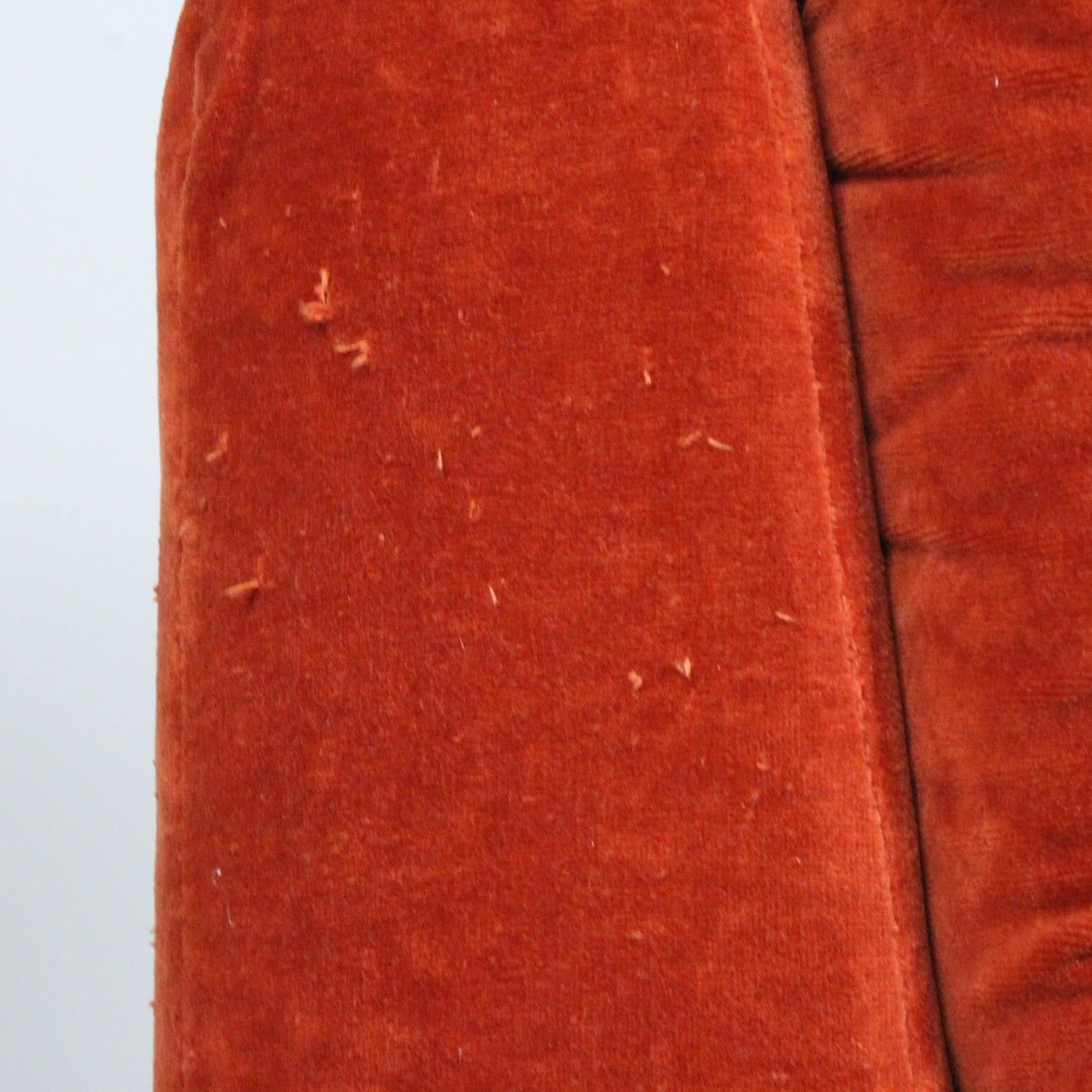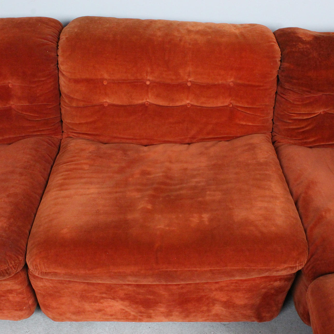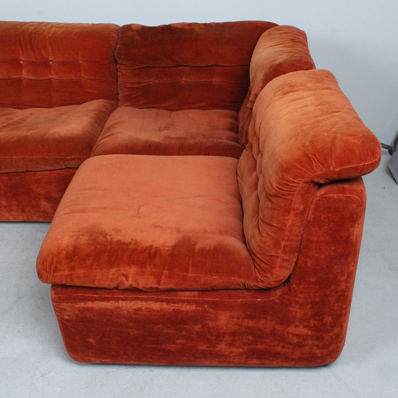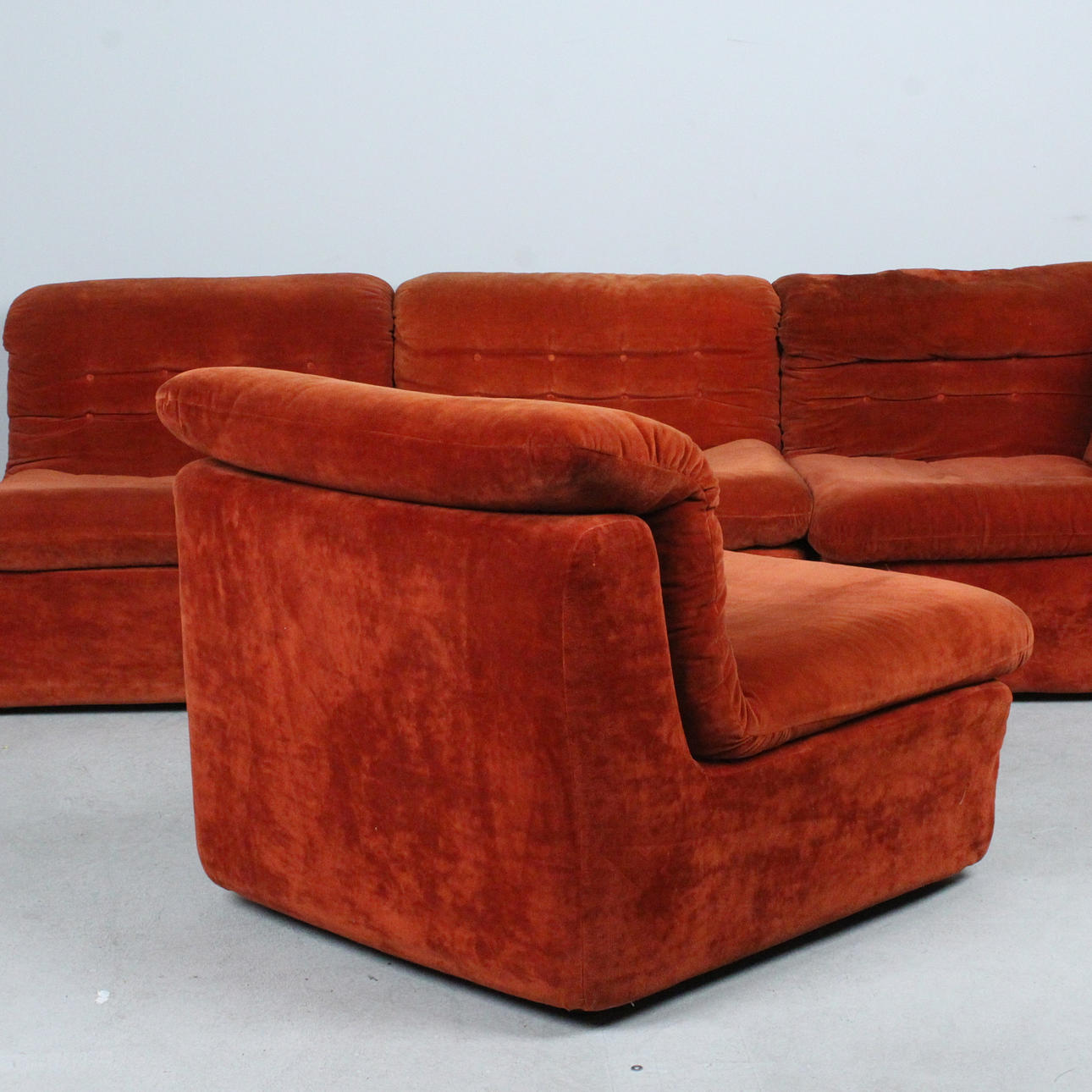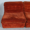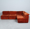 Modulares Sofa der 1960er Jahre, bestehend aus vier einzelnen Sitzelementen, leichte, aufgepolsterte Konstruktion, mit rotbraunem / rostrotem Stoff bezogen,