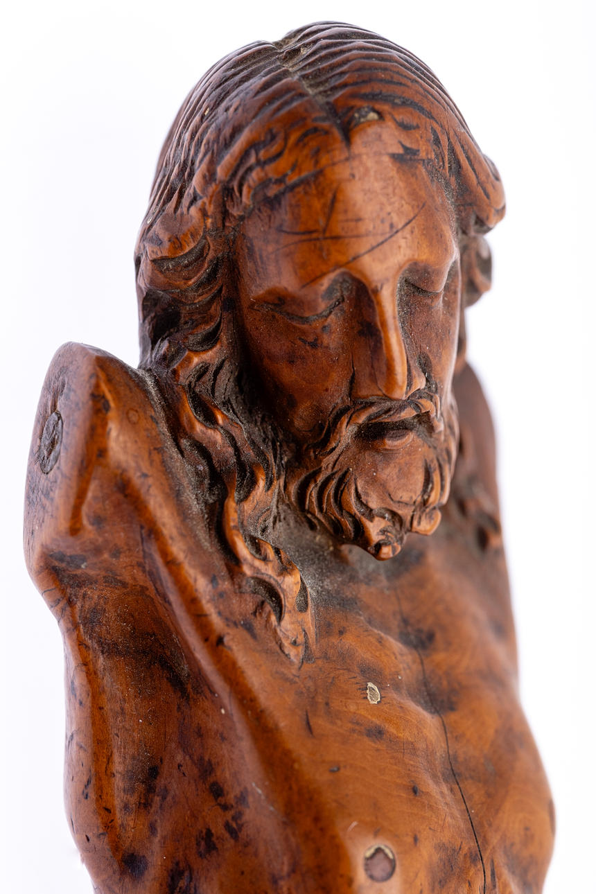 Buchsbaum geschnitzt. Feiner Gesichtsausdruck und naturalistisch gearbeiteter Korpus mit seitlich geknotetem Lendentuch, H: 21 cm.