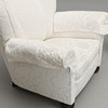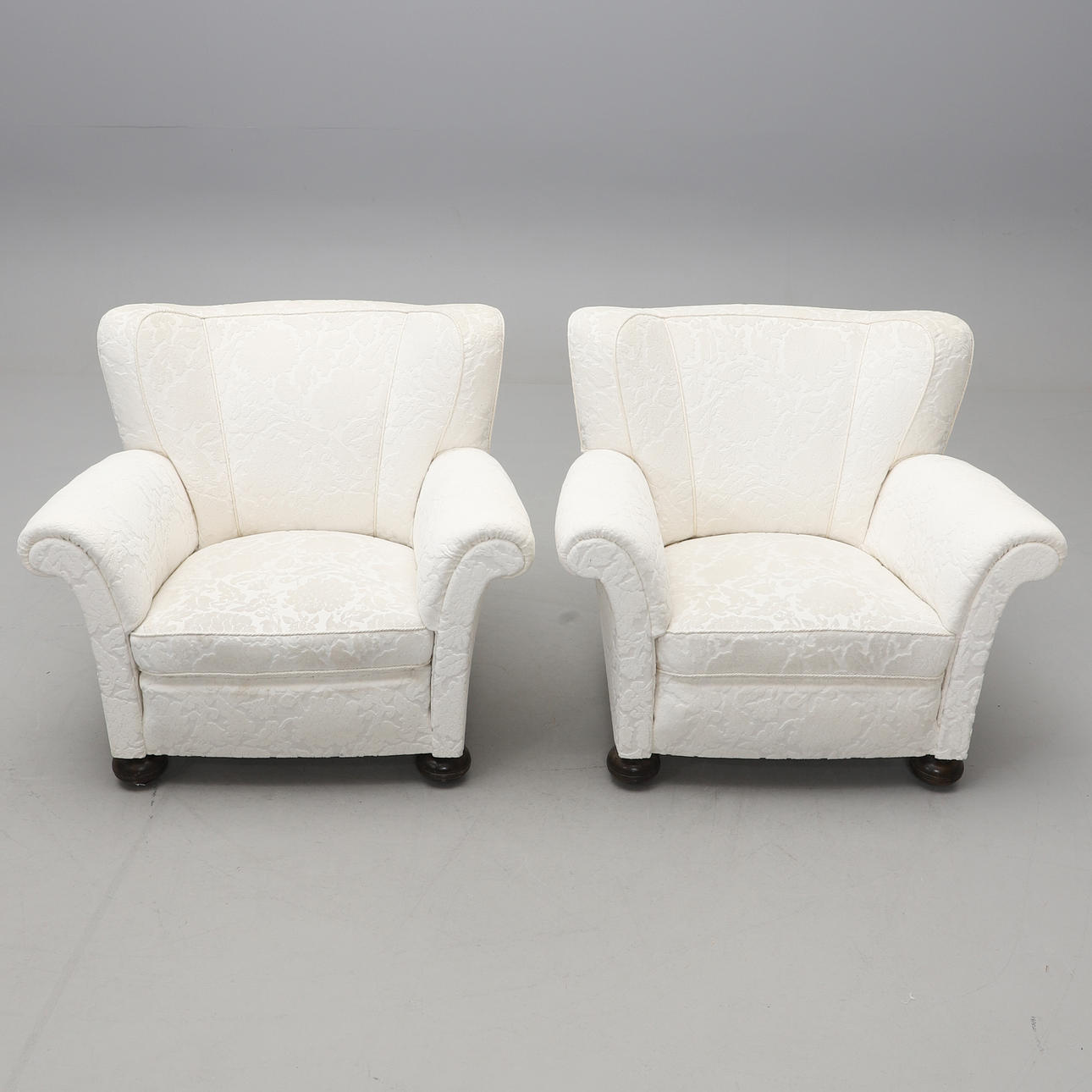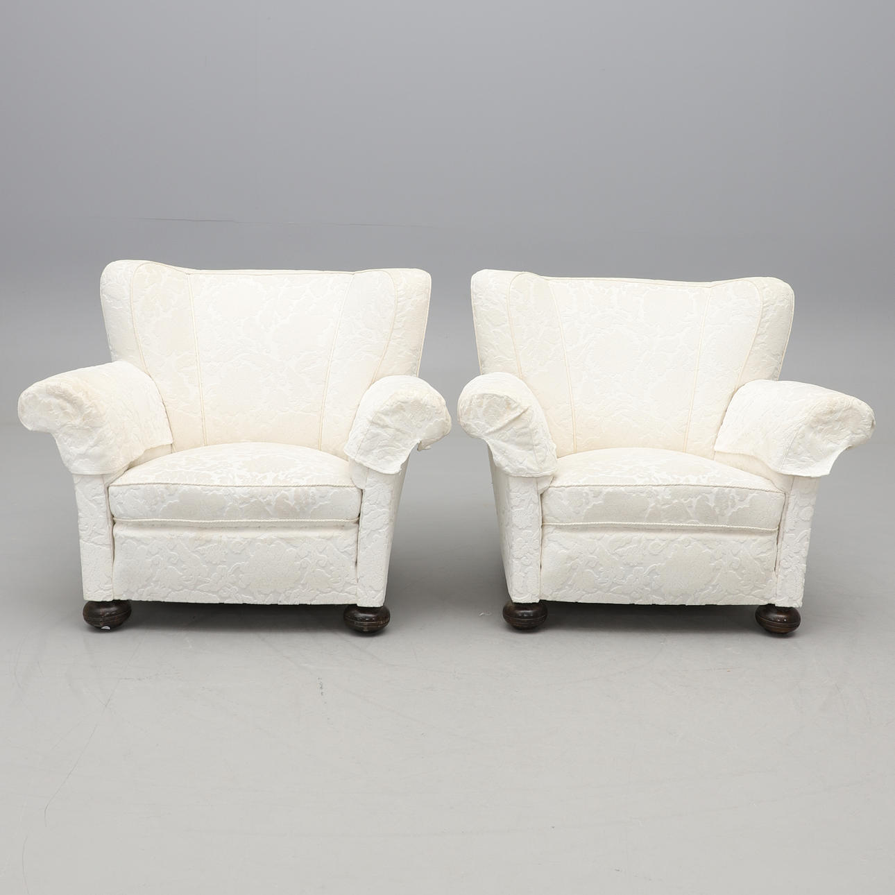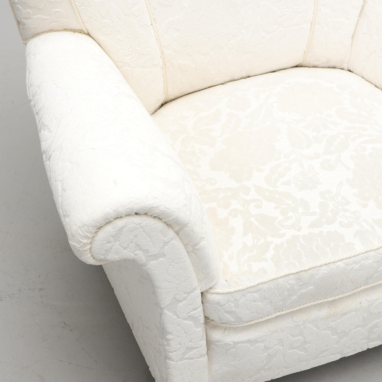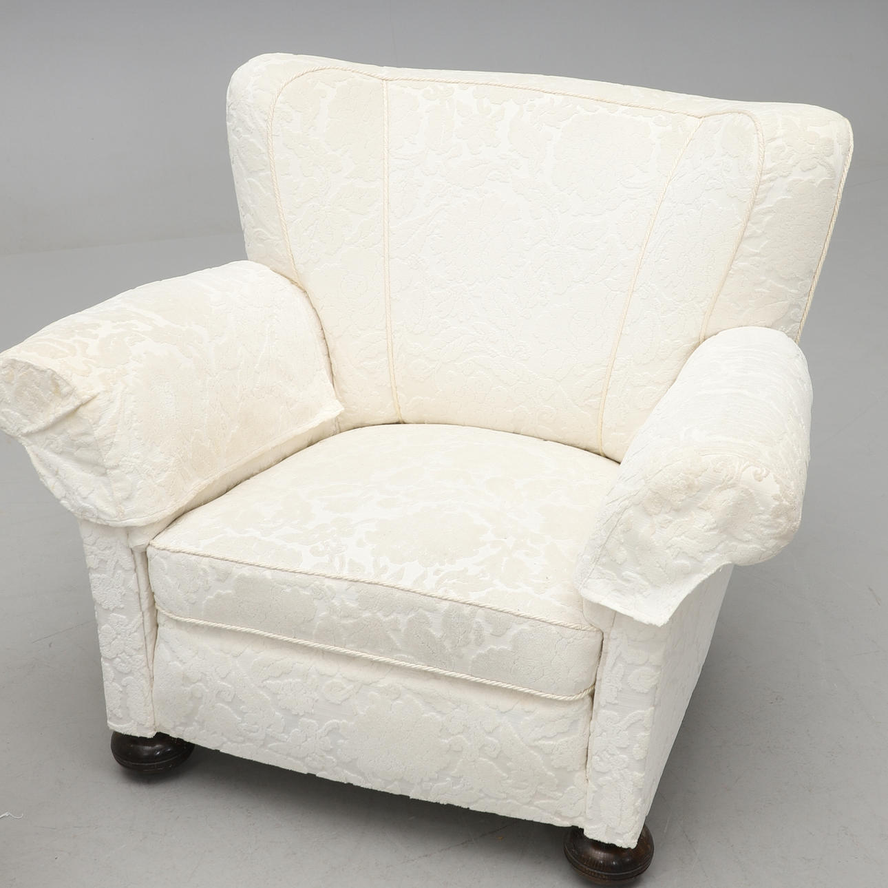 Vollständig gepolstert, bezogen mit weißem Stoff mit Reliefmuster. Befleckte Kugelfüße. Breite 102, Tiefe 90, Höhe 85 cm.
