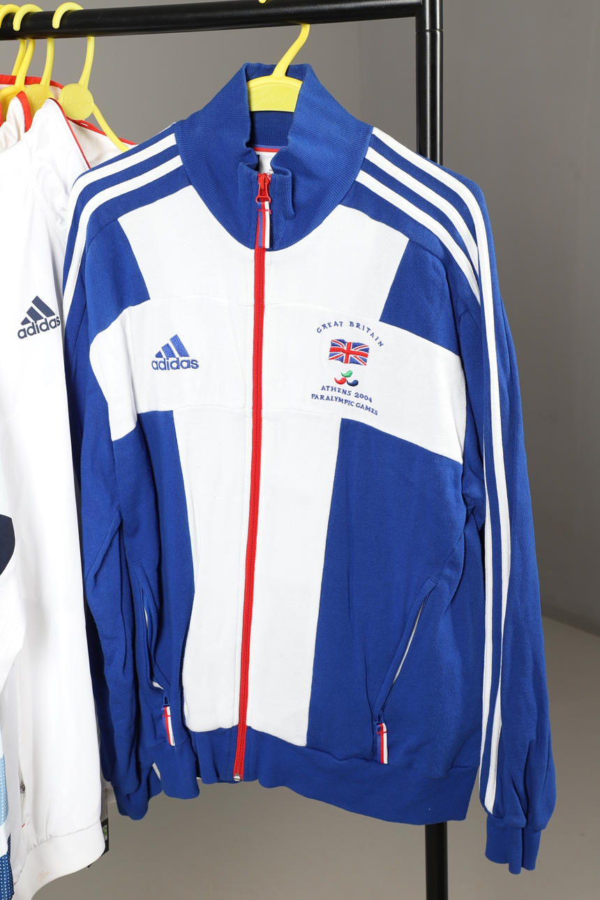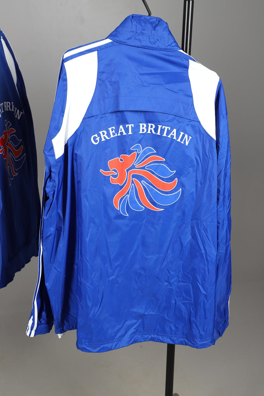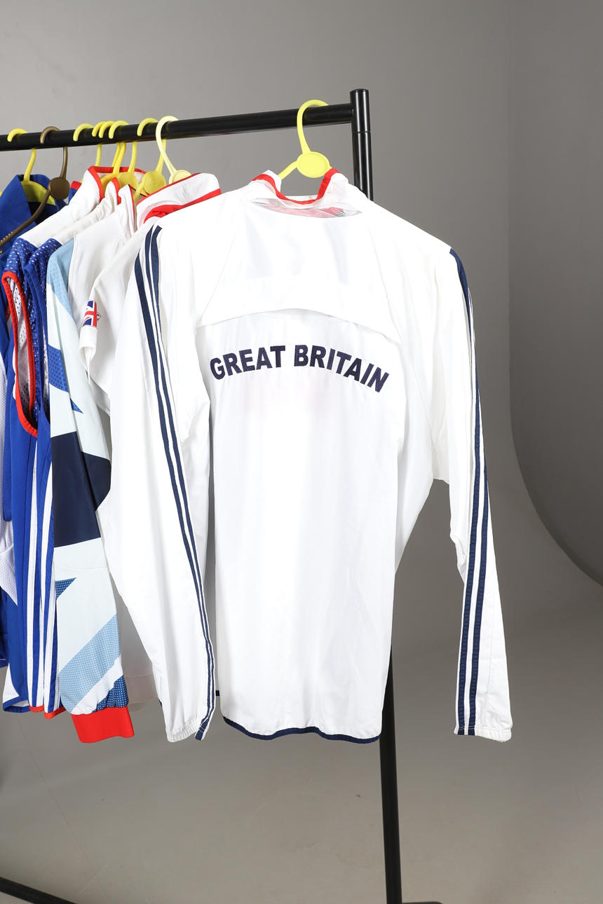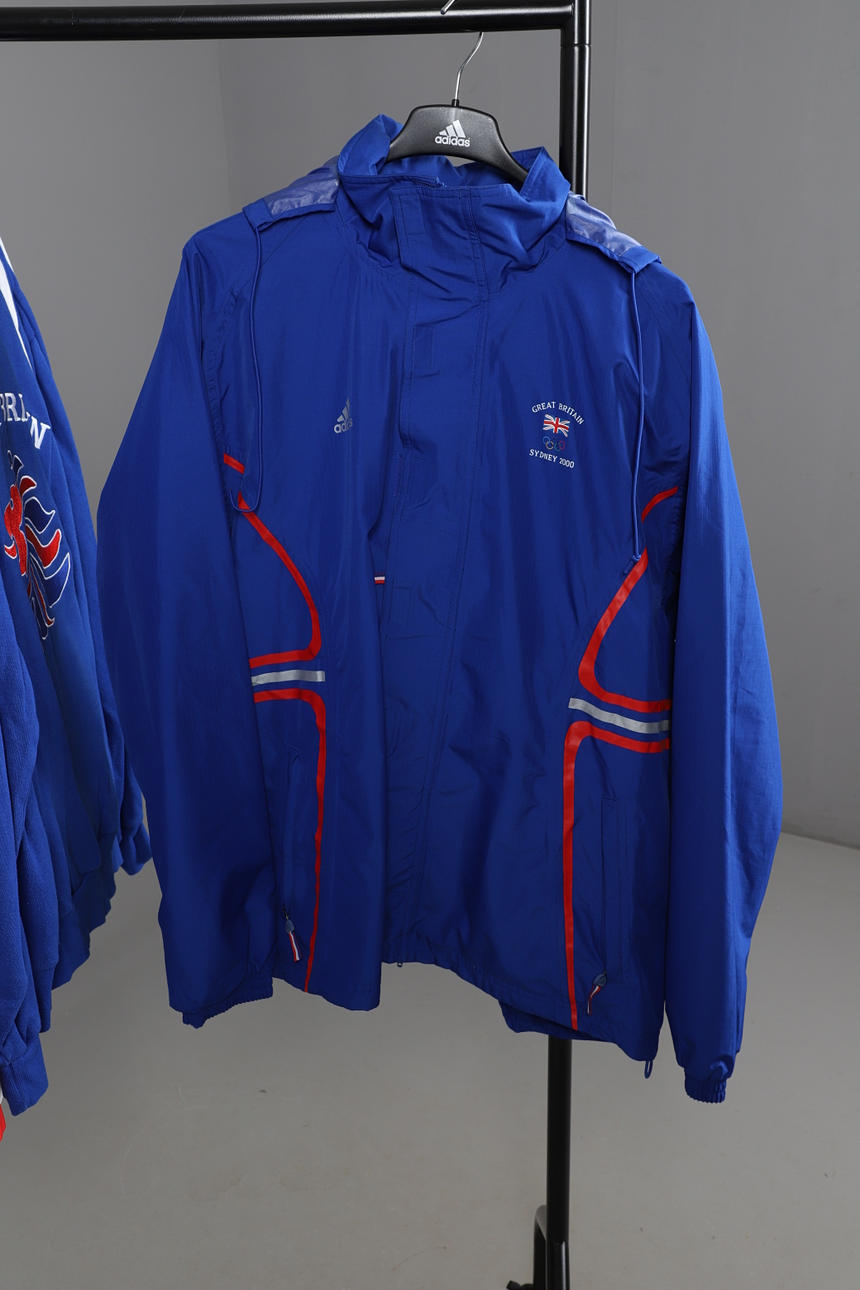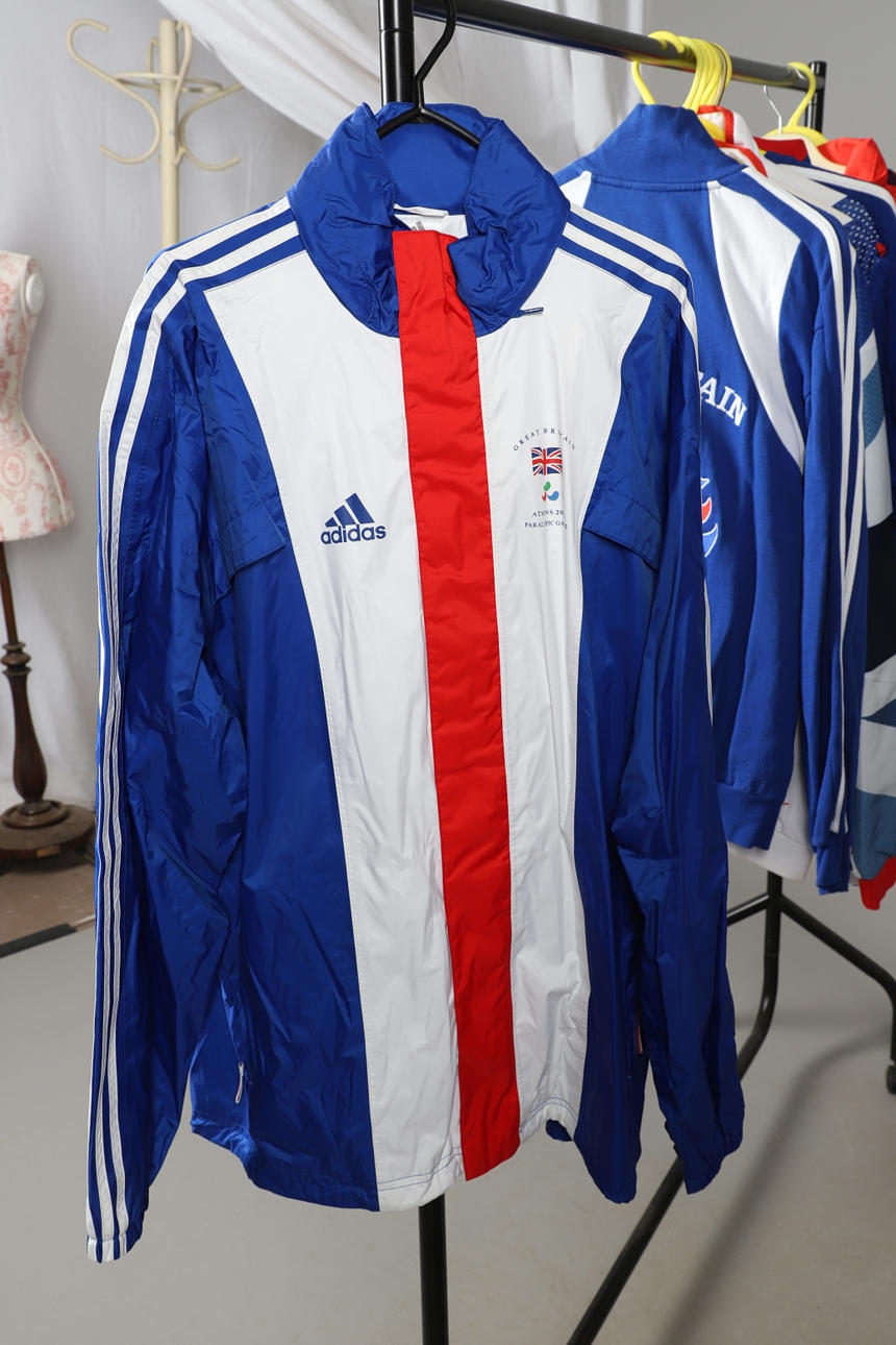Eine Vielzahl von Kleidungsstücken im Zusammenhang mit den Olympischen Spielen, darunter verschiedene wasserdichte Jacken und andere Artikel. Einschließlich Artikel von verschiedenen Olympischen Spielen, darunter 2012 in Großbritannien.