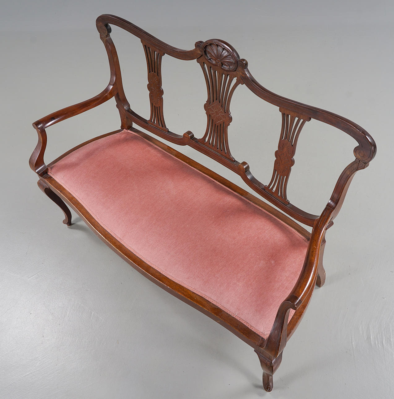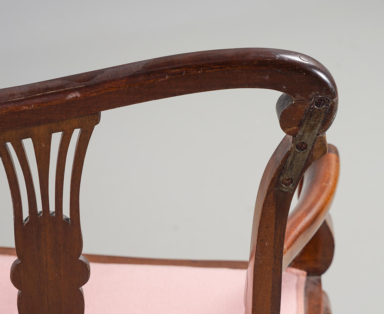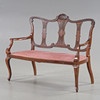 Label Stockholm, Mahagoni, durchbrochenes Rückendekor, Sitz mit Plüsch bezogen.
