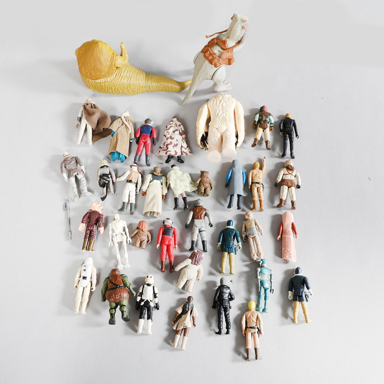 Eine Sammlung alter Kenner Star Wars-Figuren, verschiedene Charaktere, darunter Han Solo, Lando Calrissian, Ewoks, Stormtrooper, Leia, Snowtrooper, Han Solo (Hoth), 4-Lom, Bib Fortuna, A-Wing Pilot, Gamorrean Guard, Nien Nunb, Medical Droid, Ugnaught, Quarren und mehr, drei größere Figuren, darunter Jabba The Hut, Tauntaun und Wampa, größte Größe: 23 cm x 12 cm x 9 cm. (Menge).
