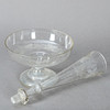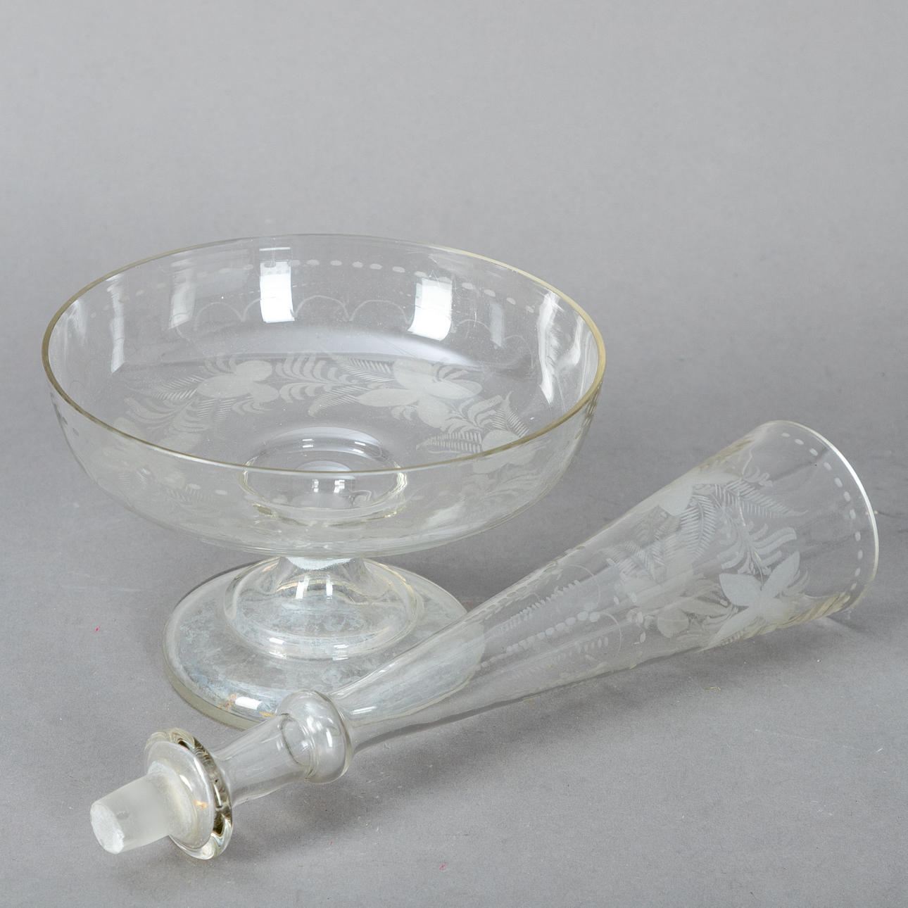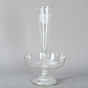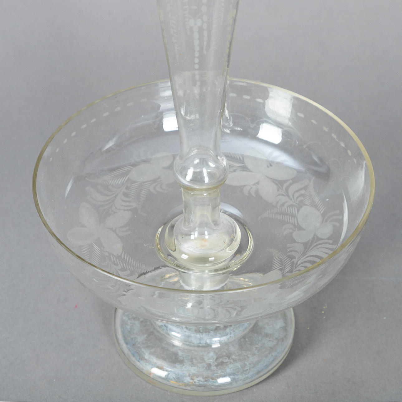 Farbloses Glas mit geätztem Dekor. 2-teilig. Aufsteigender, hohl geblasener Fuß in den runden Schaft und die gemudlete Schale Übergehend. Hoher, über Nodus konisch aufsteigender Vauseneinsatz. Umlaufende Blumenfriese und Behang. HxDm: ca. 35,5 x 19,5 cm.