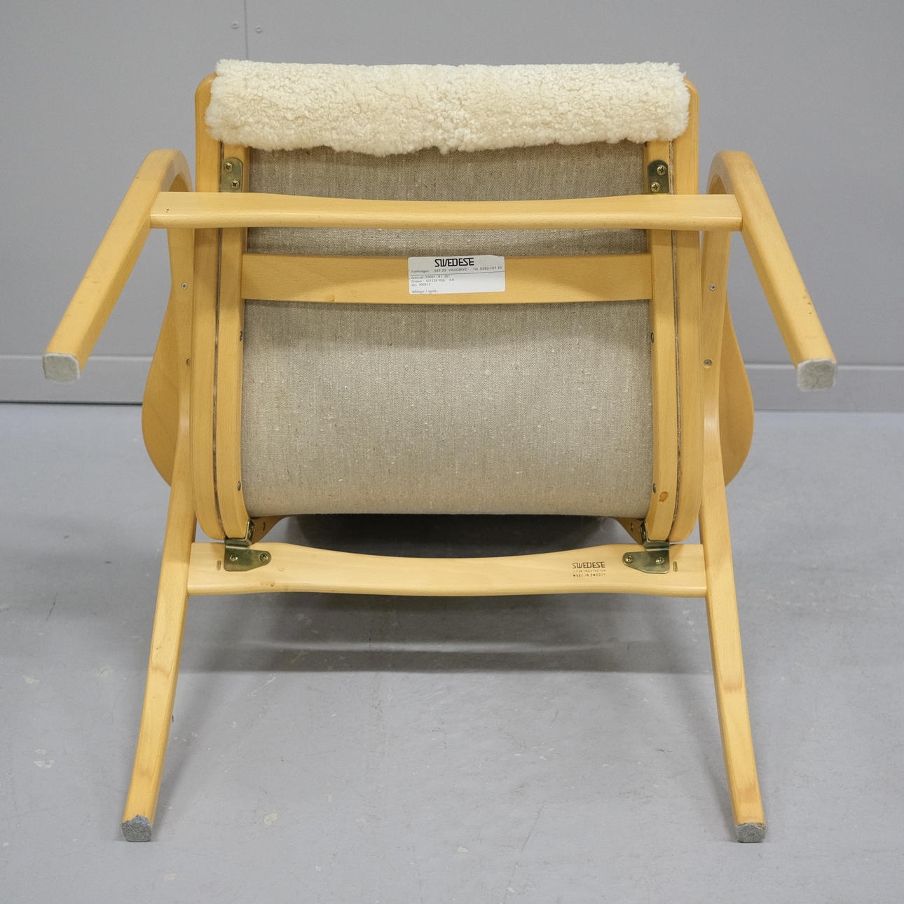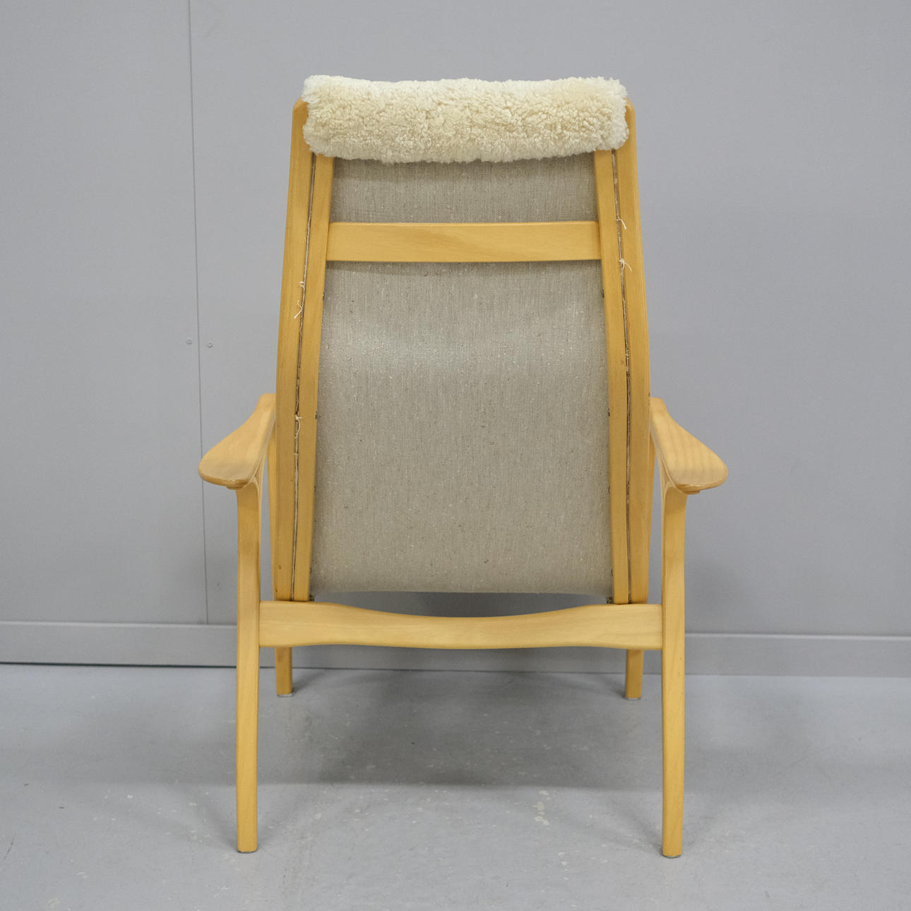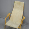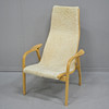 Bezug aus hellem Lammfell, Gestell Buche, gebrannter Stempel Swedwse Yngve Ekström, Höhe 102 cm, Sitzhöhe 40 cm, Breite 69 cm.