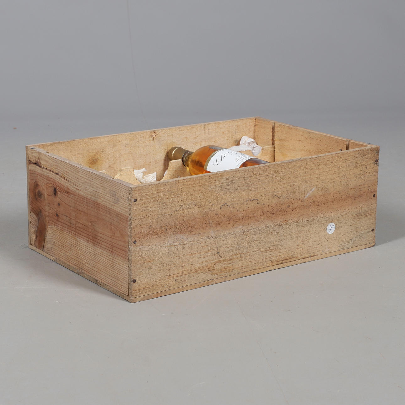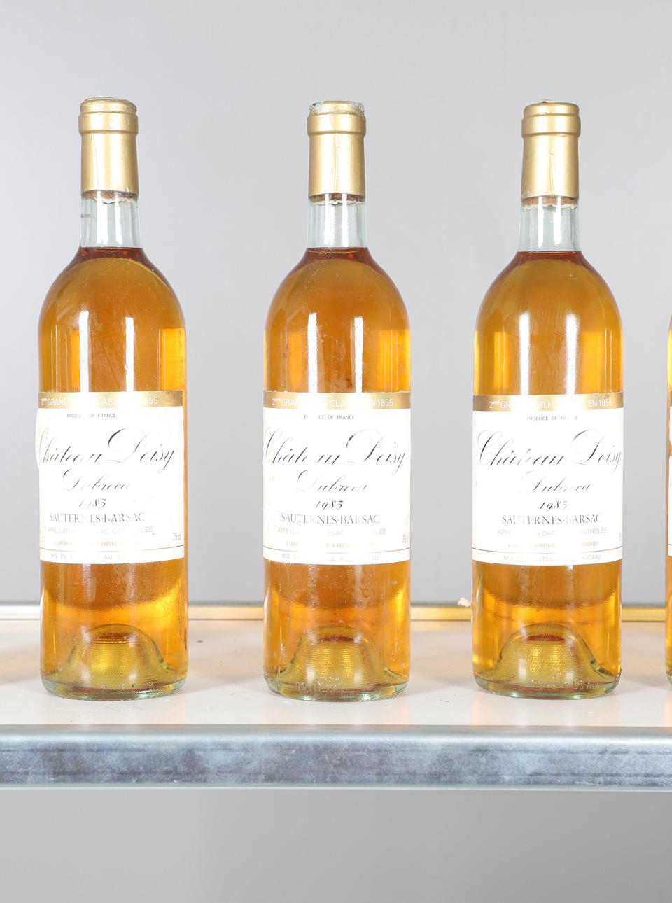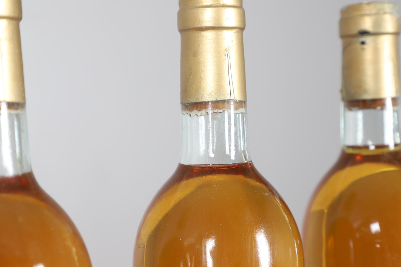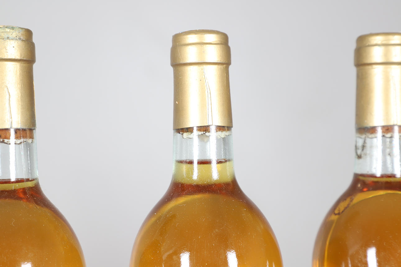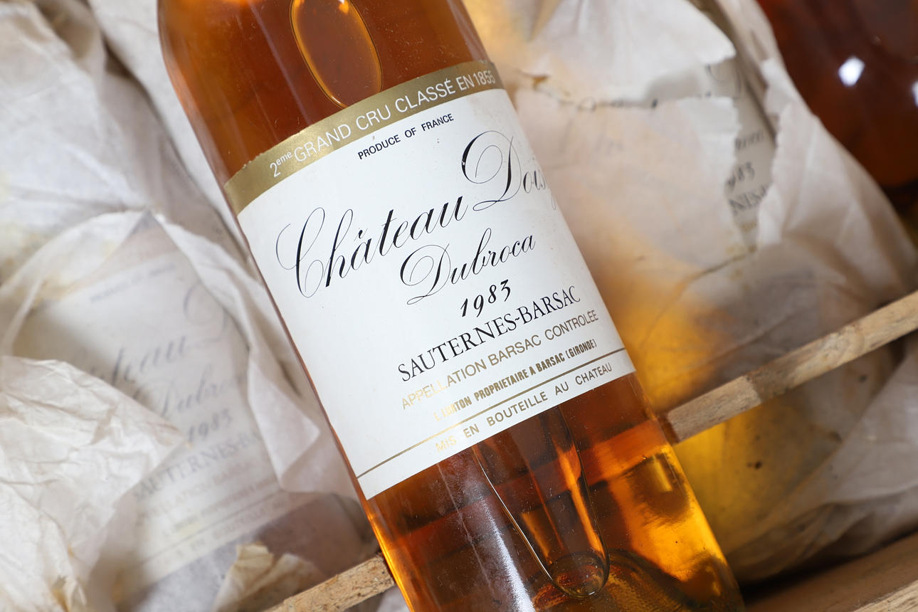 Sieben Flaschen Chateau Doisy Sauternes Barsac, 1983, 750 ml und teilweise in einer Holzkiste enthalten. Flaschen 30 cm hoch, Etui 50 cm x 33 cm