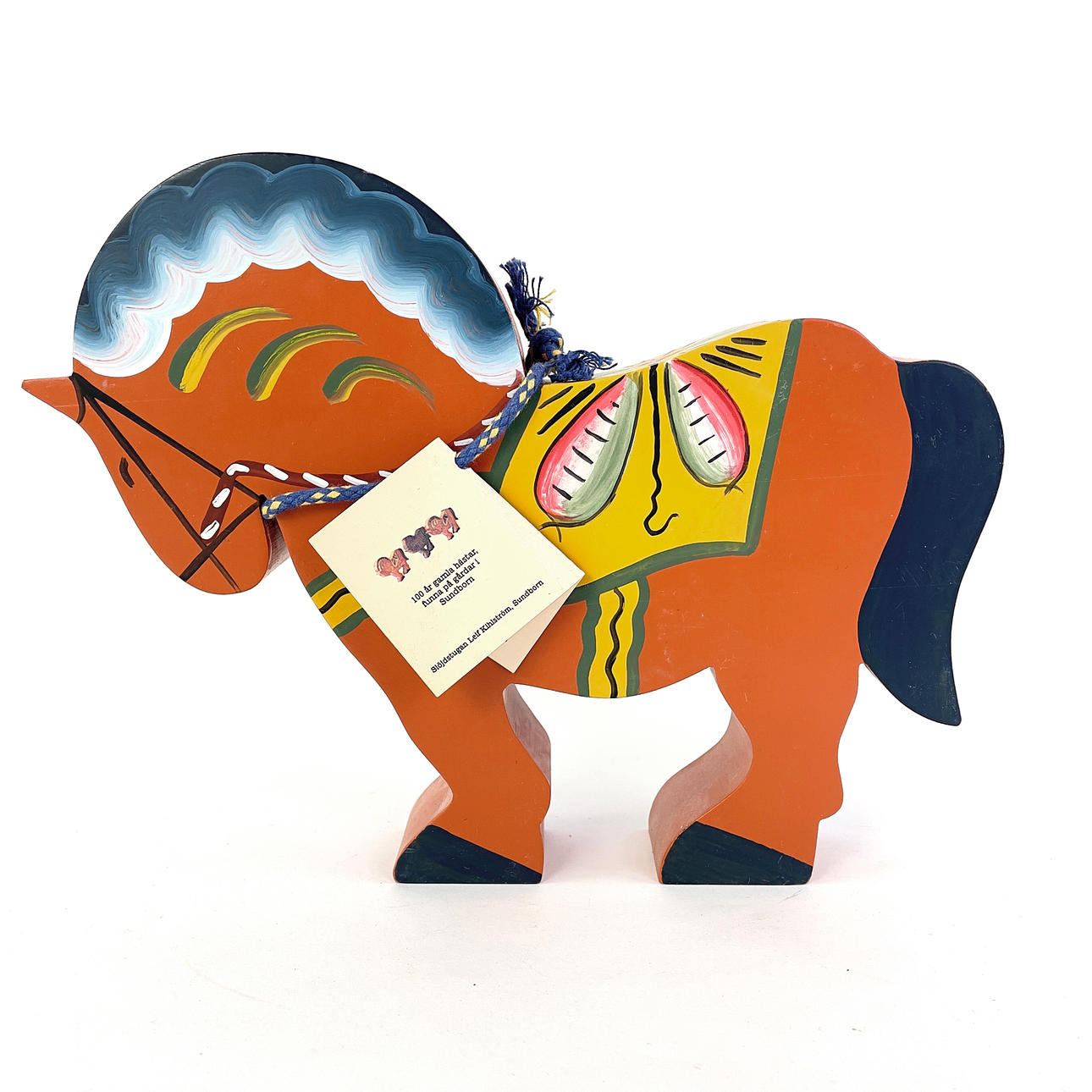 1 Etikett mit der Aufschrift Nils Olsson, Nusnäs, Höhe ca. 10 cm, Länge ca. 9 cm