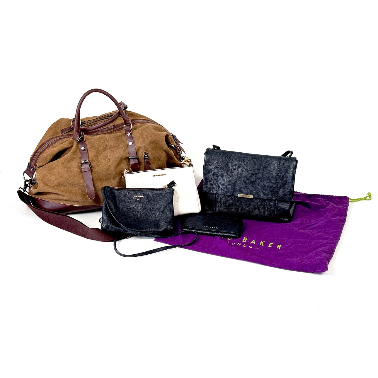 Eine schwarze Lederhandtasche von Ted Baker und andere.