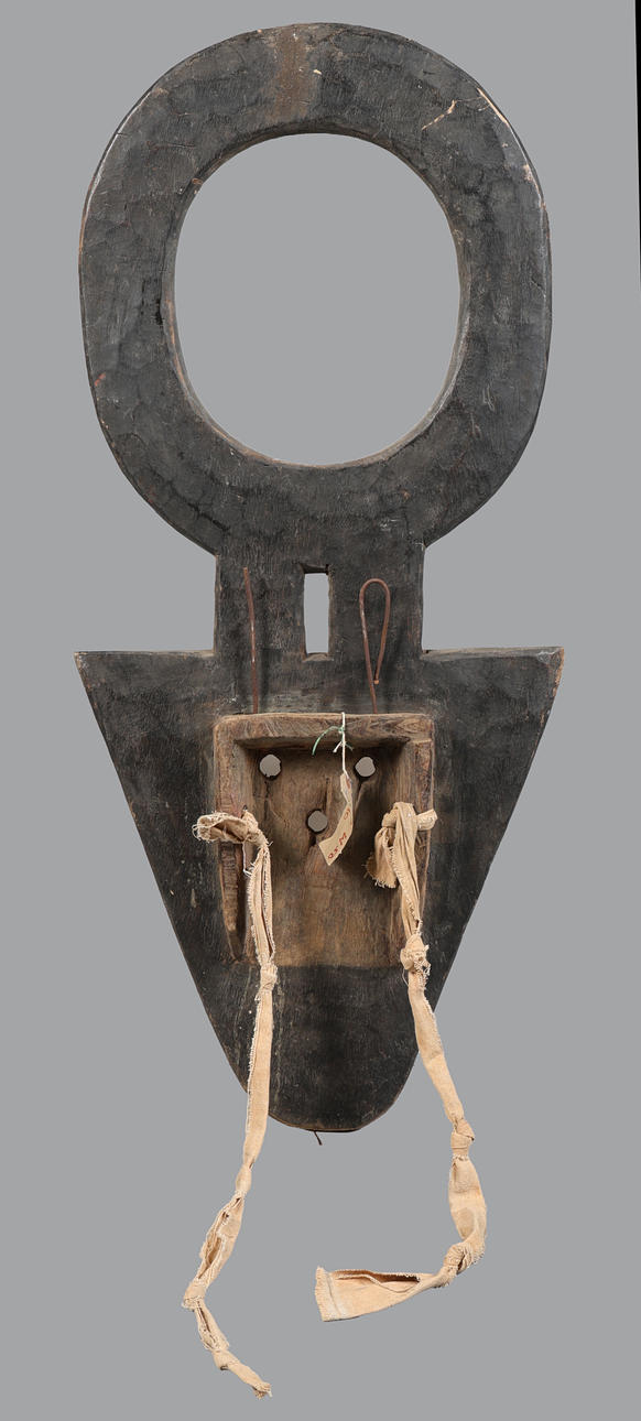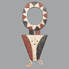 Zweites Drittel des 20. Jahrhunderts, bestehend aus einem kräftigen ringförmigen oberen Teil, bemalt mit abwechselnd roten, weißen und schwarzen dreieckigen Strahlen, die Sonnen- oder Geisterenergie symbolisieren. Darunter eine scharf zulaufende geometrische Schnauze oder Gesichtsprojektion, ebenfalls in Rot-Schwarz-Weiß bemalt, 109 cm hoch