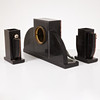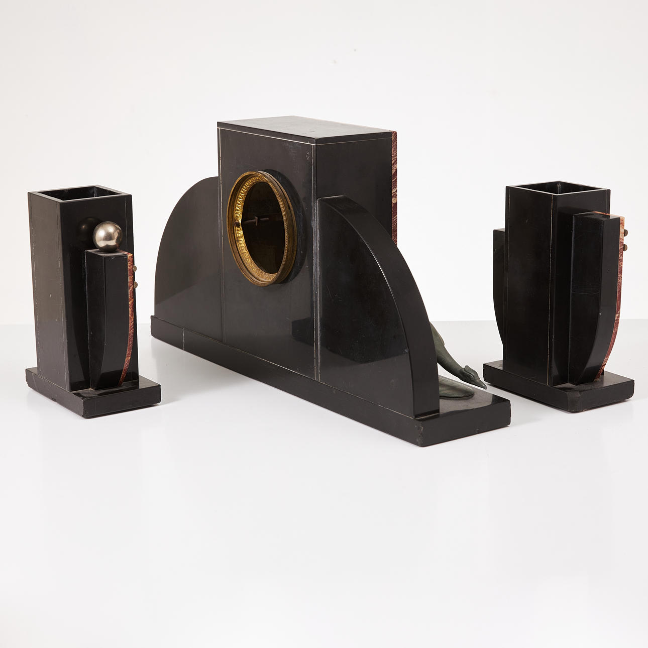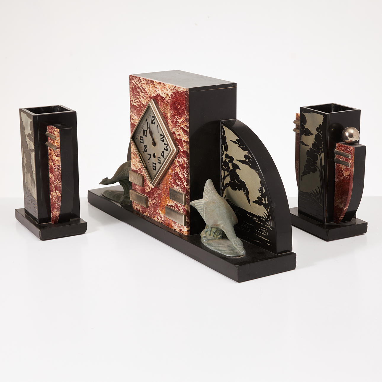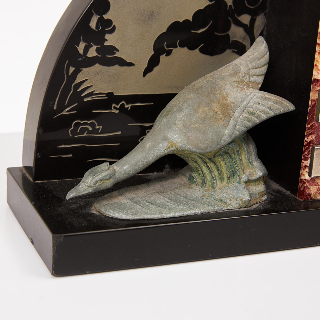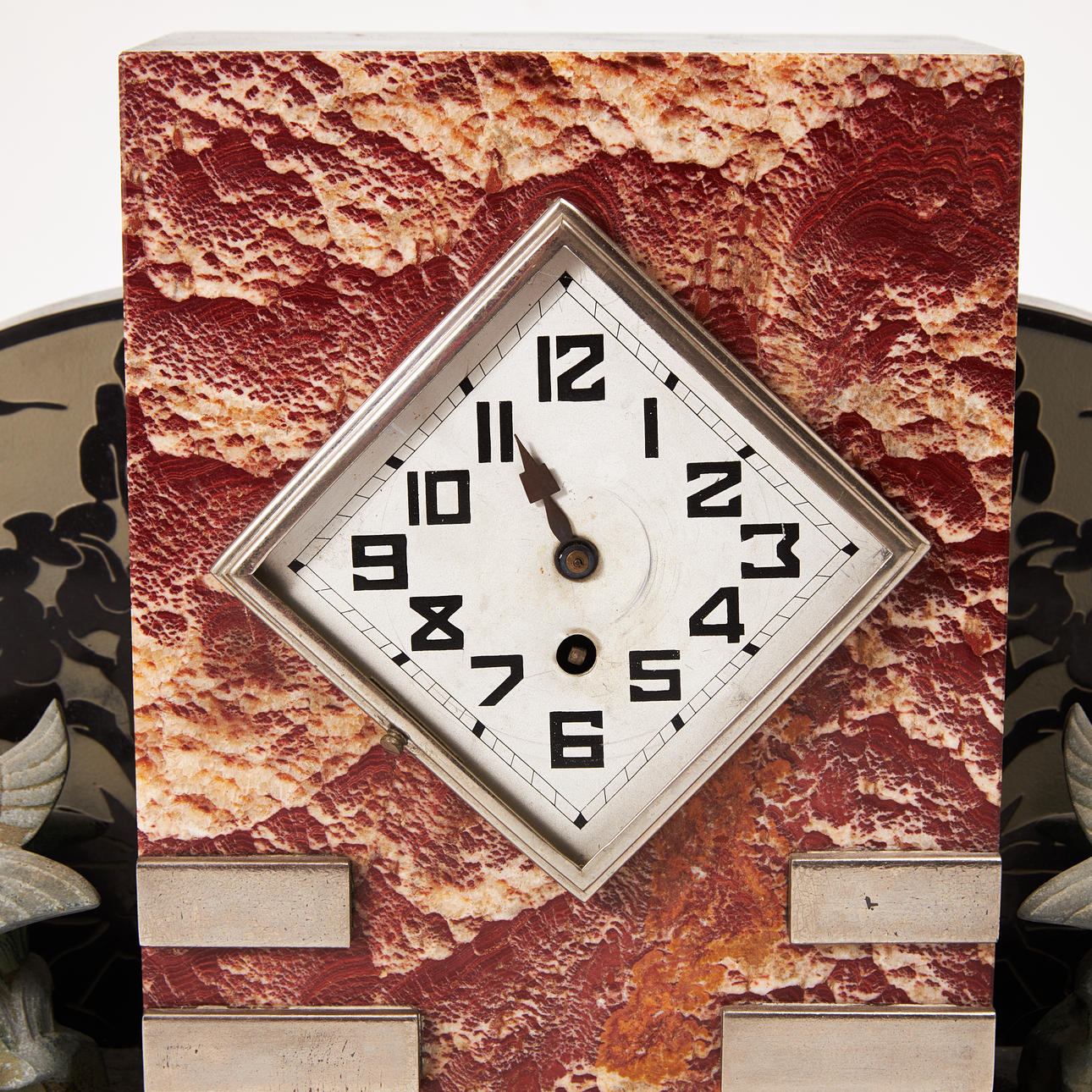 Dekor aus geschliffenem Stein, Chromdetails, Tischuhr mit Vogeldekor, Höhe 22-27, Länge der Uhr 51 cm.