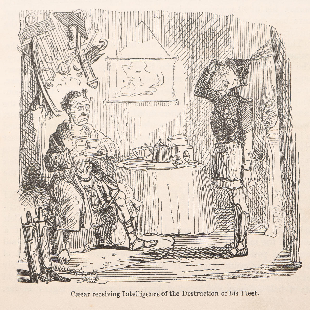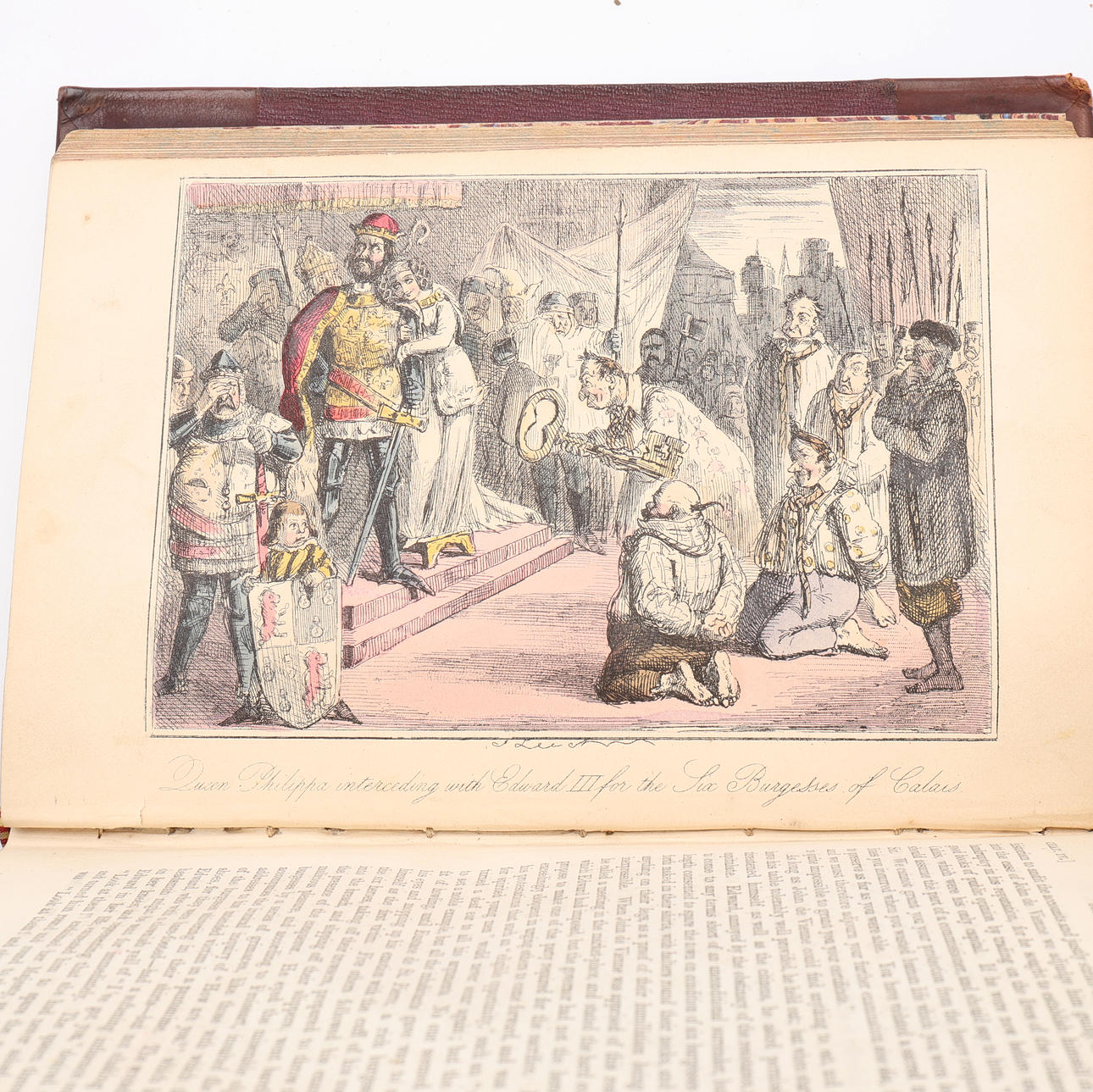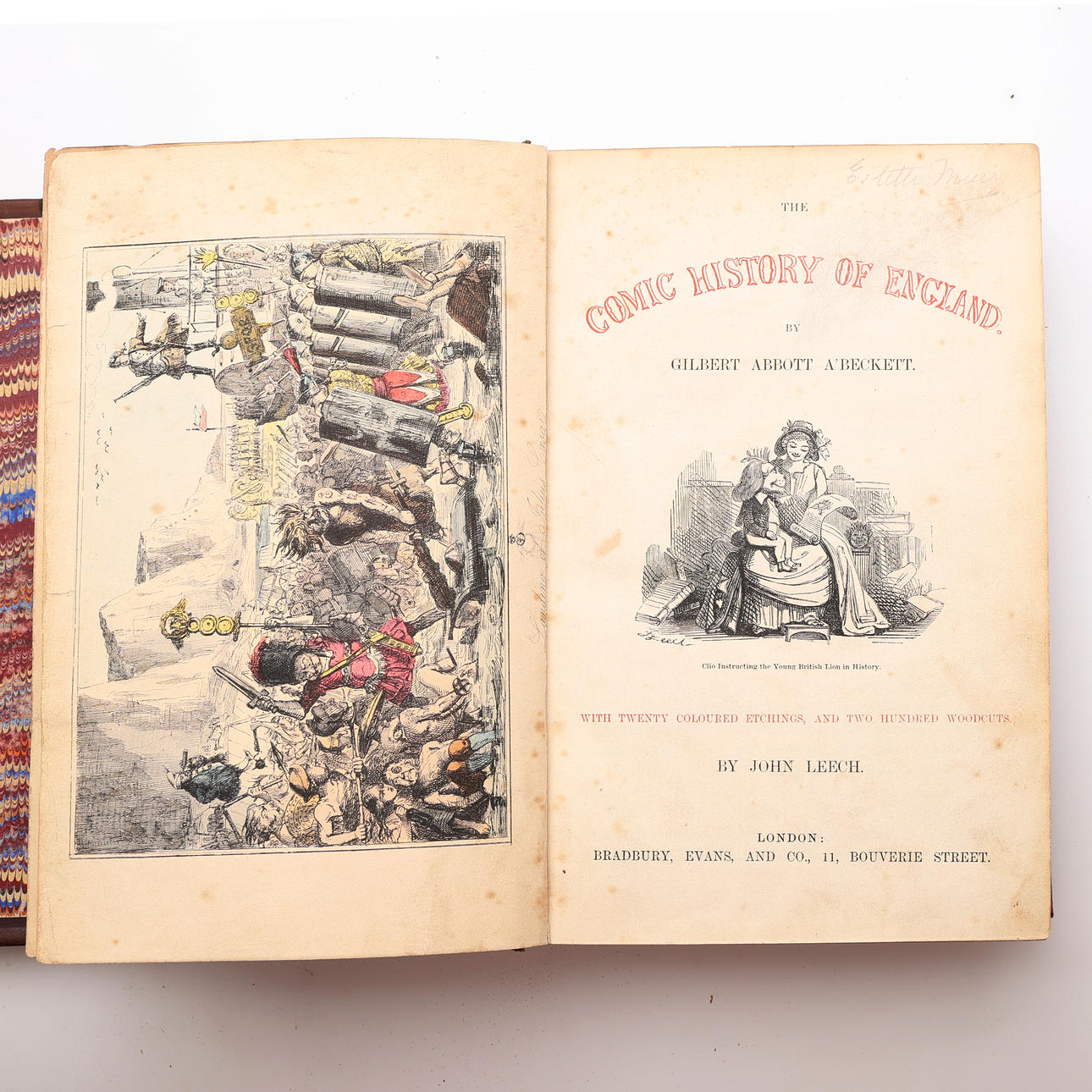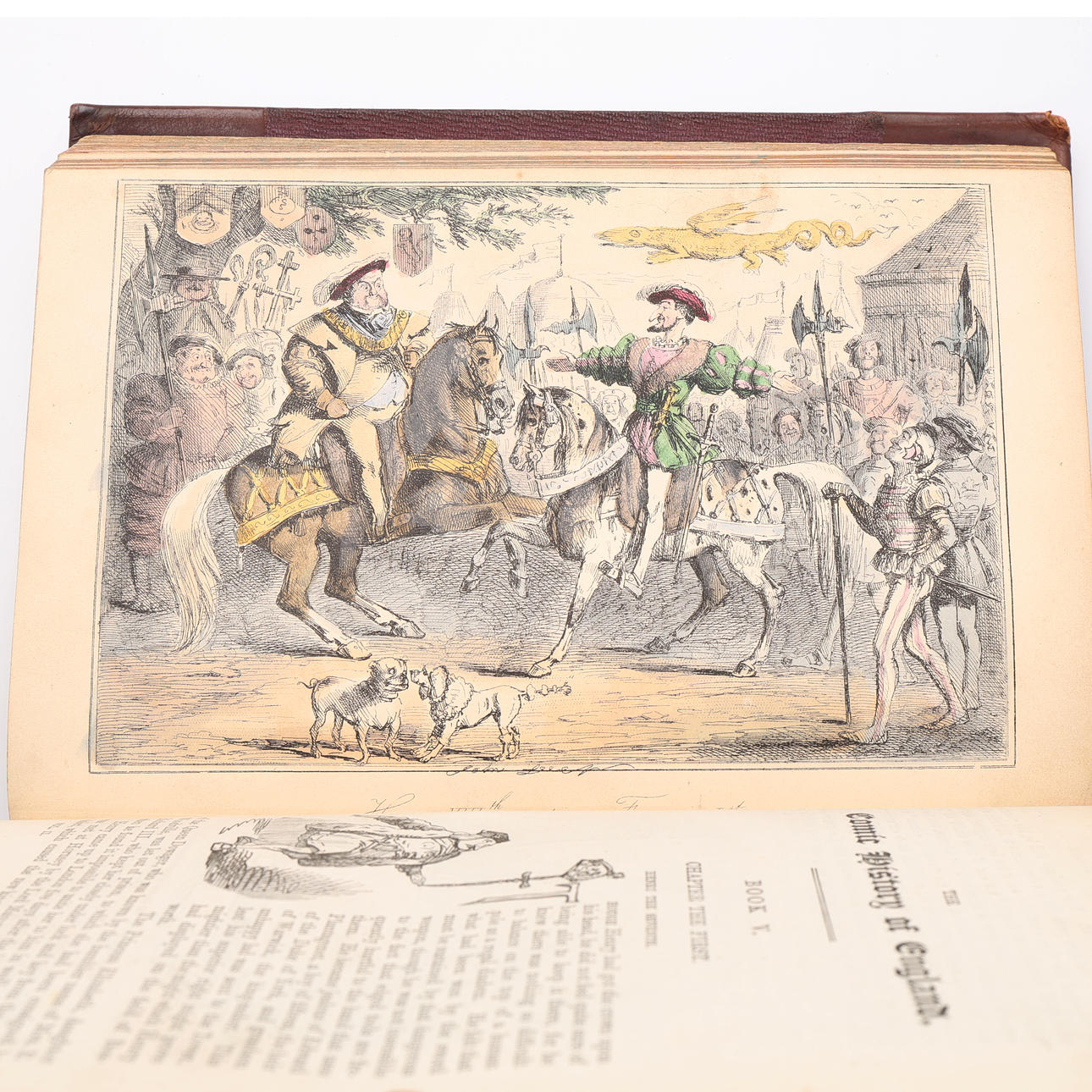 A'Beckett, Gilbert Abbott, Text und Leech, John, Illustrator. Die Comic-Geschichte Englands. Mit zwanzig Farbradierungen und zweihundert Holzschnitten. Bradbury, Evans and Co., London, ohne Jahr. (Um 1870). 8vo in einer älteren halbfranzösischen Band mit marmorierten Schnitten. XVIII, 320 S. + handkolorierte Tafeln und 404 S. + handgefärbte Bretter.