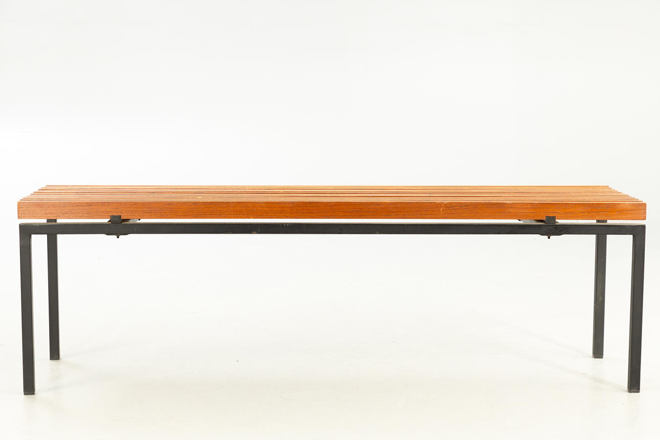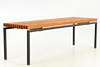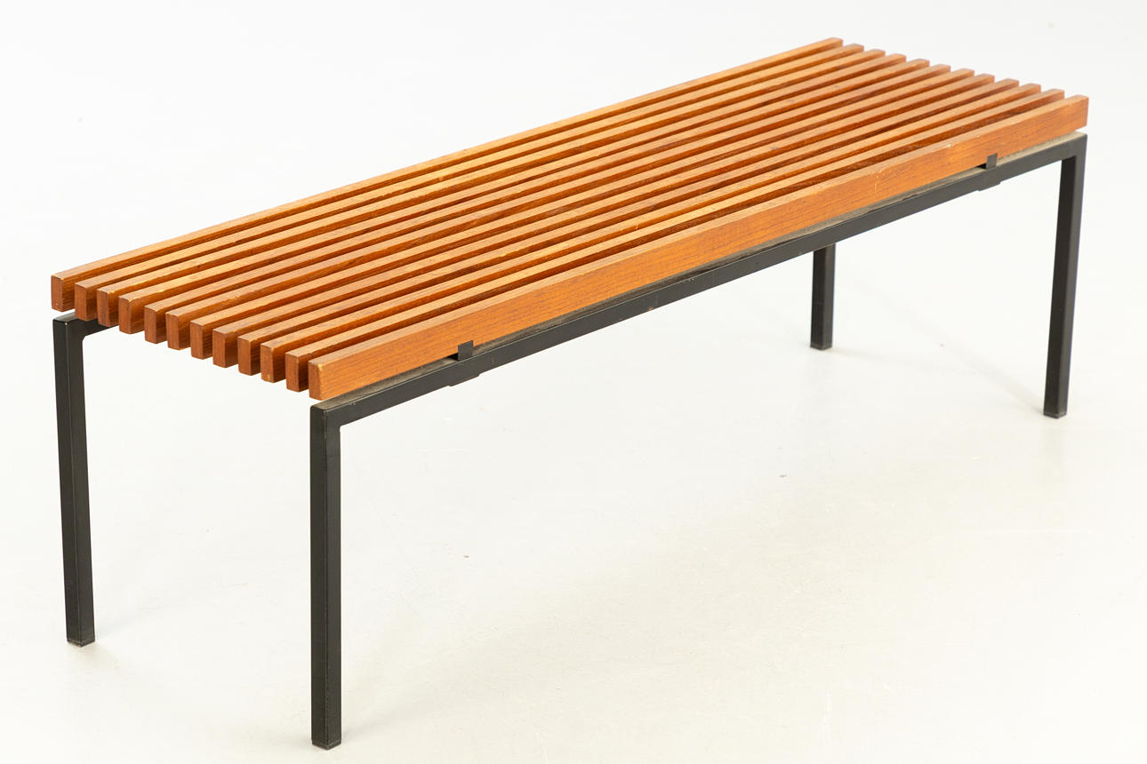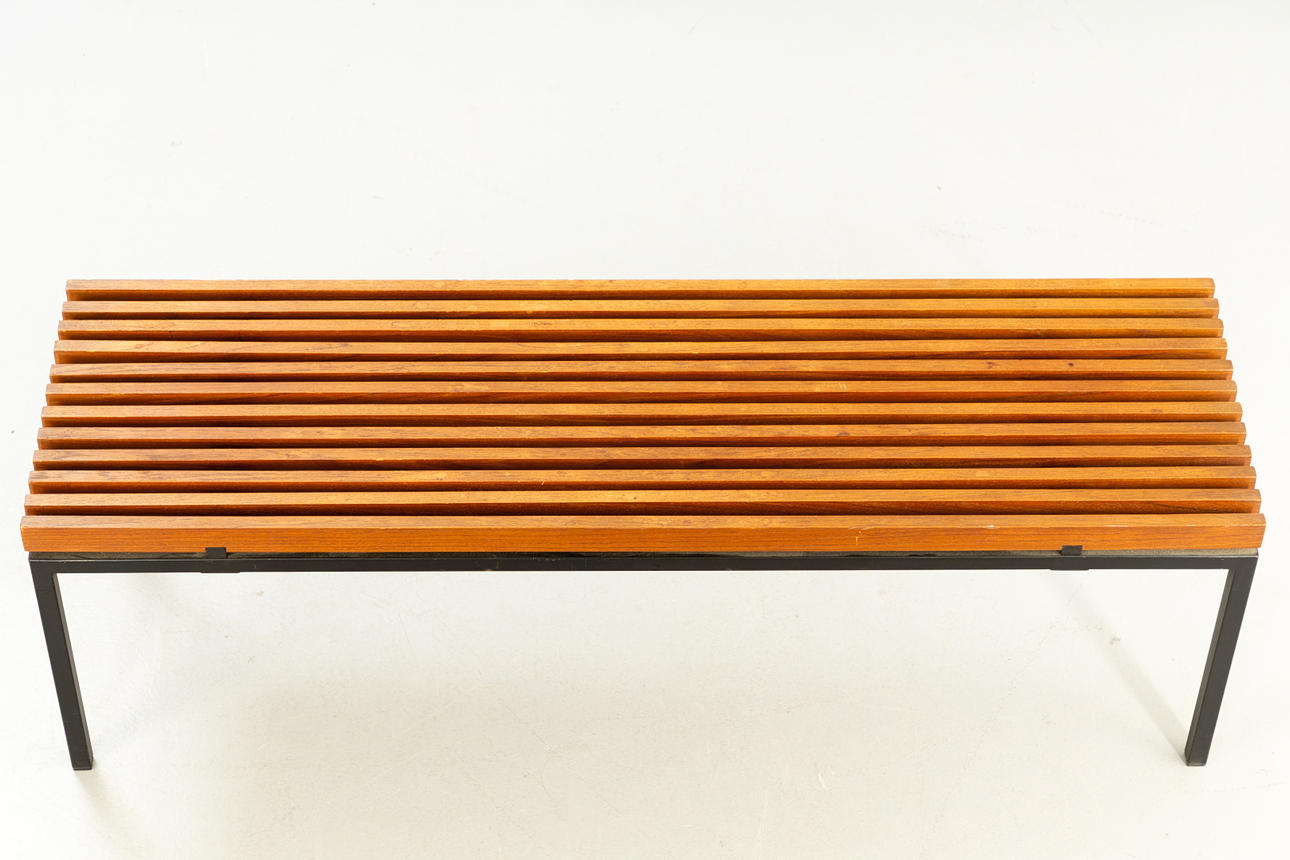 Gestell aus Vierkant-Metallrohr in schwarz. Sitzfläche aus Vierkant Teakholzlatten.