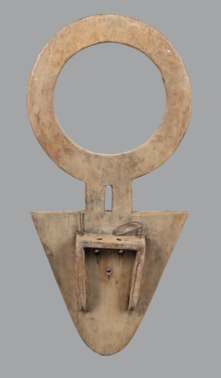 Zweites Drittel des 20. Jahrhunderts, Die Maske ist in einer großen kreisförmigen Form mit offener Mitte geschnitzt und wird von kräftigen geometrischen Motiven in schwarzen, weißen, blauen und roten Pigmenten überragt. Der obere Ring weist abwechselnd dreieckige Muster auf, während der untere Teil eine sich verjüngende Planke mit einem zentralen herzförmigen Motiv bildet, das mit zwei Augenlöchern durchbohrt ist und 112 cm hoch und 52 cm breit ist.