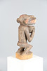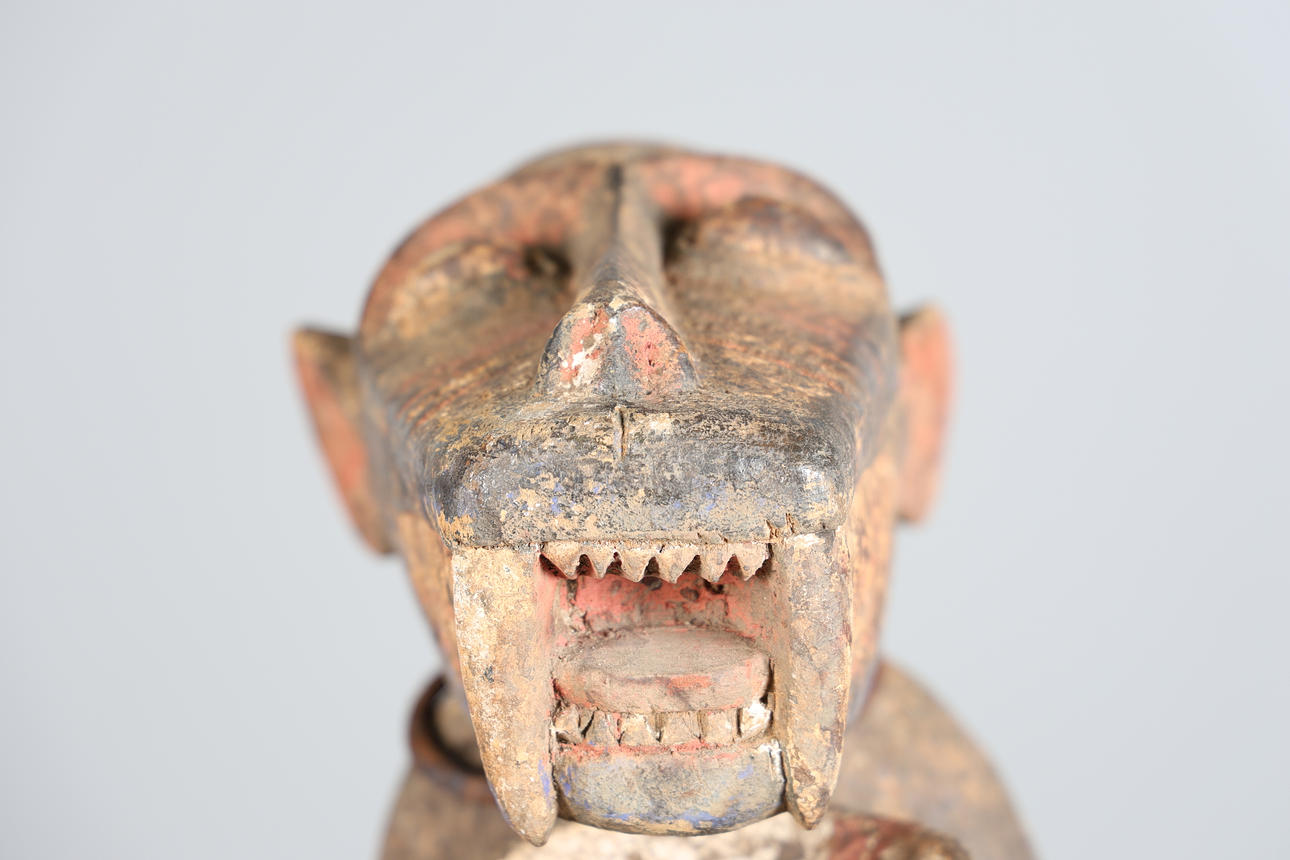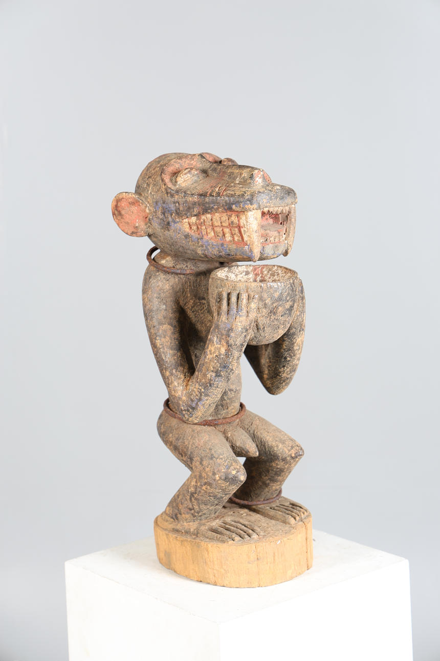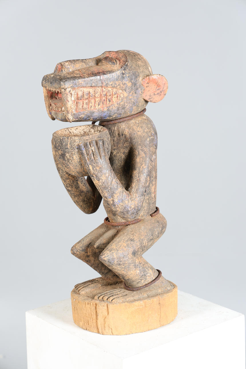 Im zweiten Drittel des 20. Jahrhunderts wird die Figur von einem ausdrucksstarken Affenkopf gekrönt, in den runde Augen, weit geweitete Nasenlöcher und ein offener Mund mit hervorstehenden, übertriebenen Reißzähnen geschnitzt sind. Die Kreatur hockt auf einer ovalen Basis, die Knie fest an den Körper gezogen, und fasst zwischen ihren erhobenen Händen ein zylindrisches Opfergefäß. Eingeritzte Details im Gesicht und an den Gliedmaßen sind mit Spuren von rotem und weißem Pigment hervorgehoben, 58 cm hoch und 18 cm breit