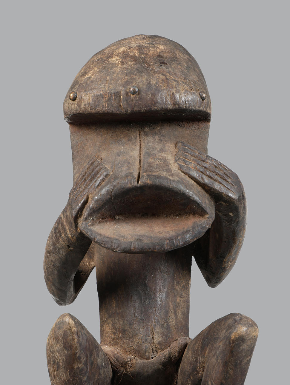 allgemeine Gebrauchsspuren, ein Riss am Kopf der Figur.
