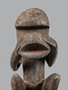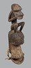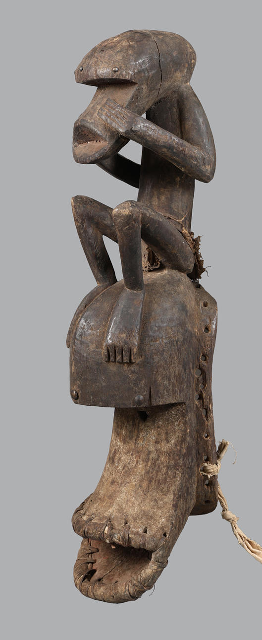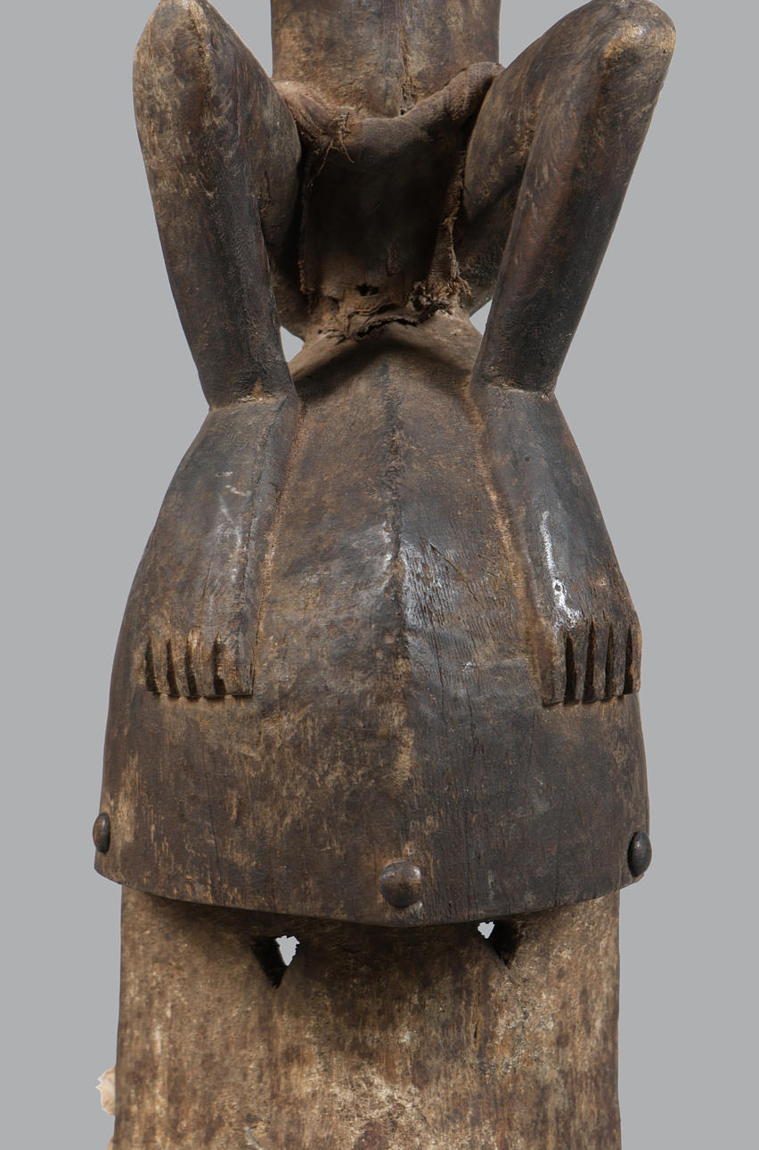 Im zweiten Drittel des 20. Jahrhunderts, geschnitzt mit einer Figur, die auf der Maske sitzt, ist die Maske mit einer breiten, ausladenden, zylindrischen Schnauze gekrönt, die in eingewickeltes Leder eingefasst ist, 100 cm hoch und 26 cm breit
