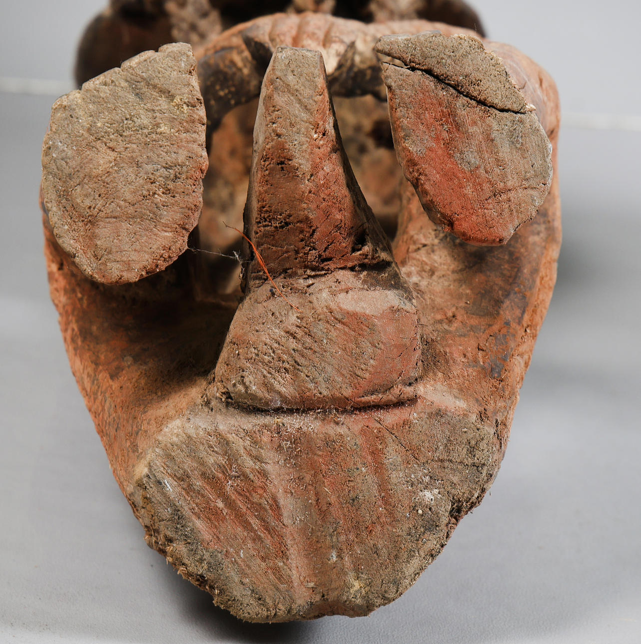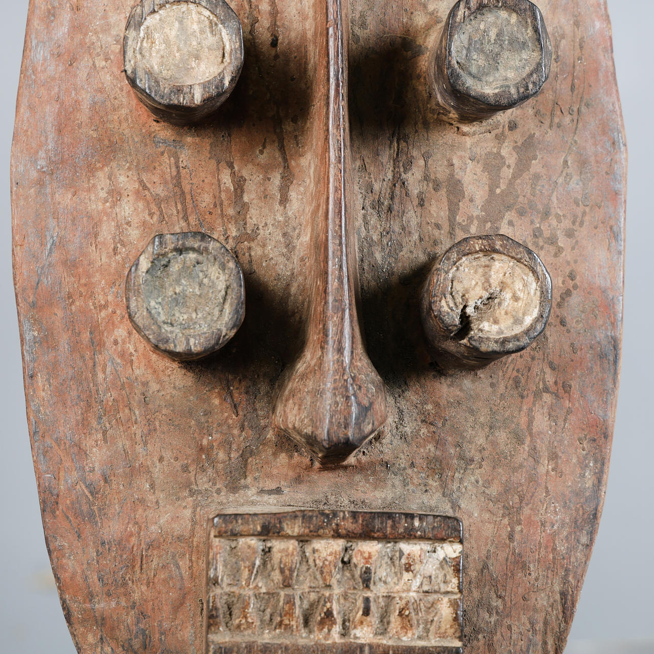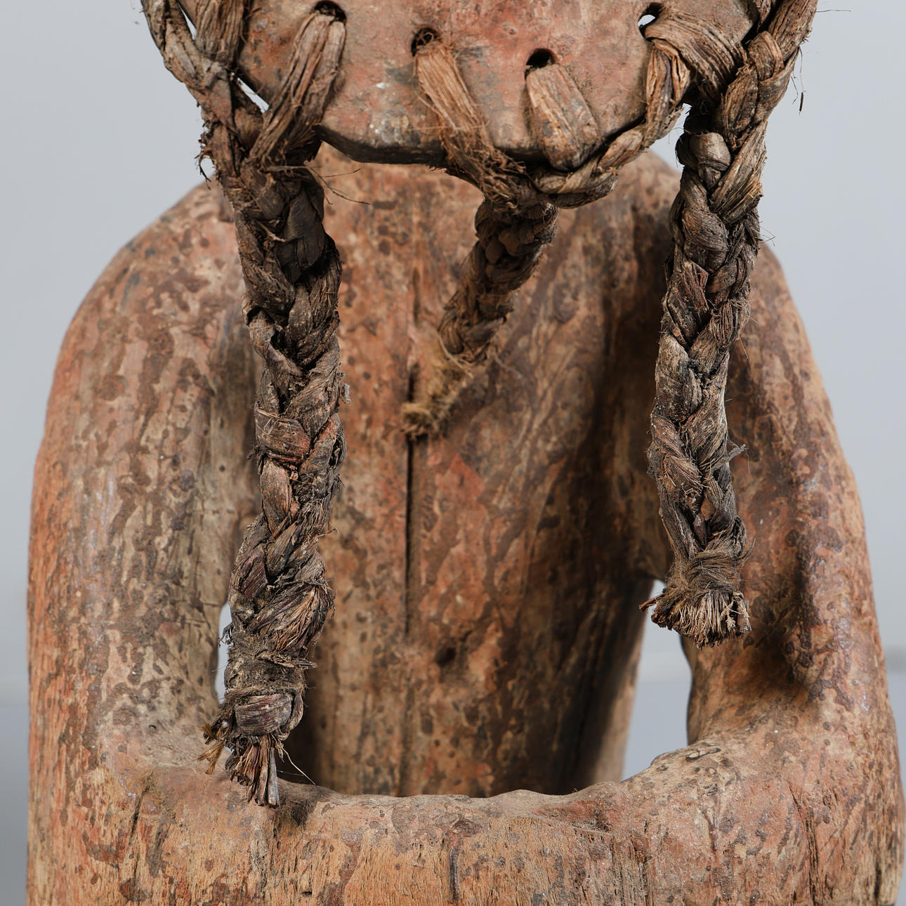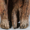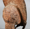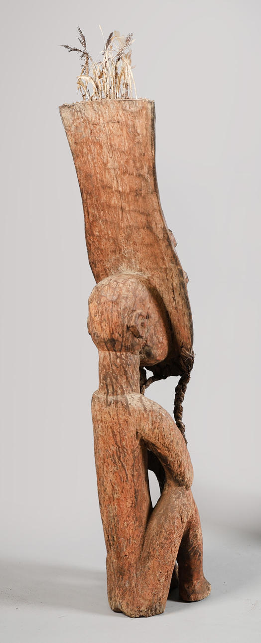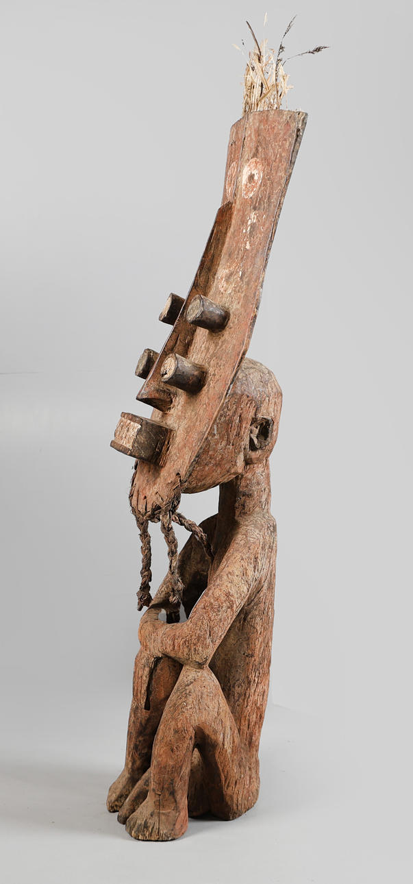 Zweites Drittel des 20. Jahrhunderts, hohe rechteckige Kopfplatte mit aufgesetzten kreisförmigen Noppen und geometrischem Mundstück, überragt von Federresten und Pigmentspuren. Tief eingeschnittene Augen flankieren einen langen Nasenkamm. Die Figur ist sitzend mit an den Knien verbundenen Händen dargestellt, 131 cm hoch und 24 cm breit