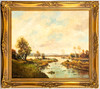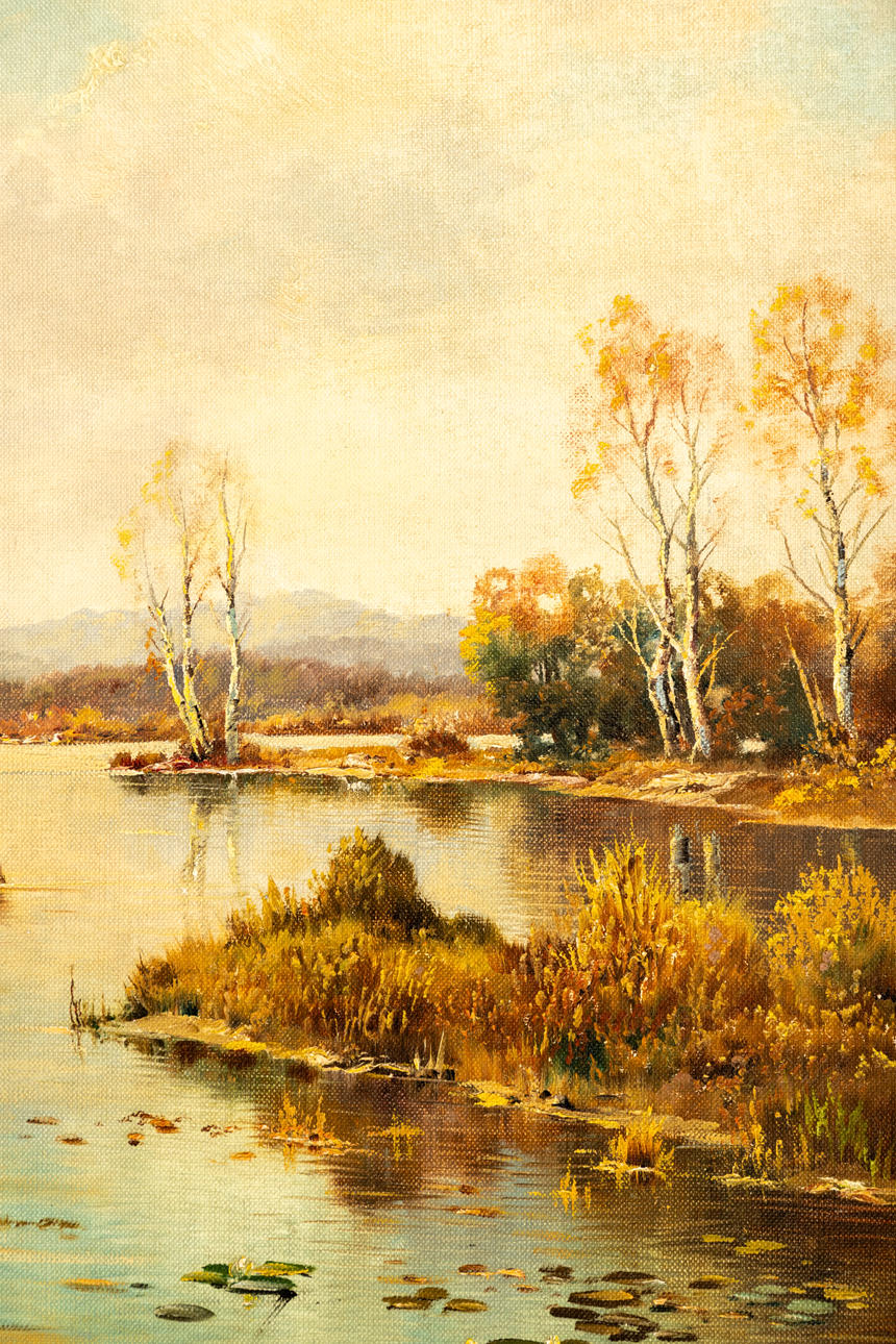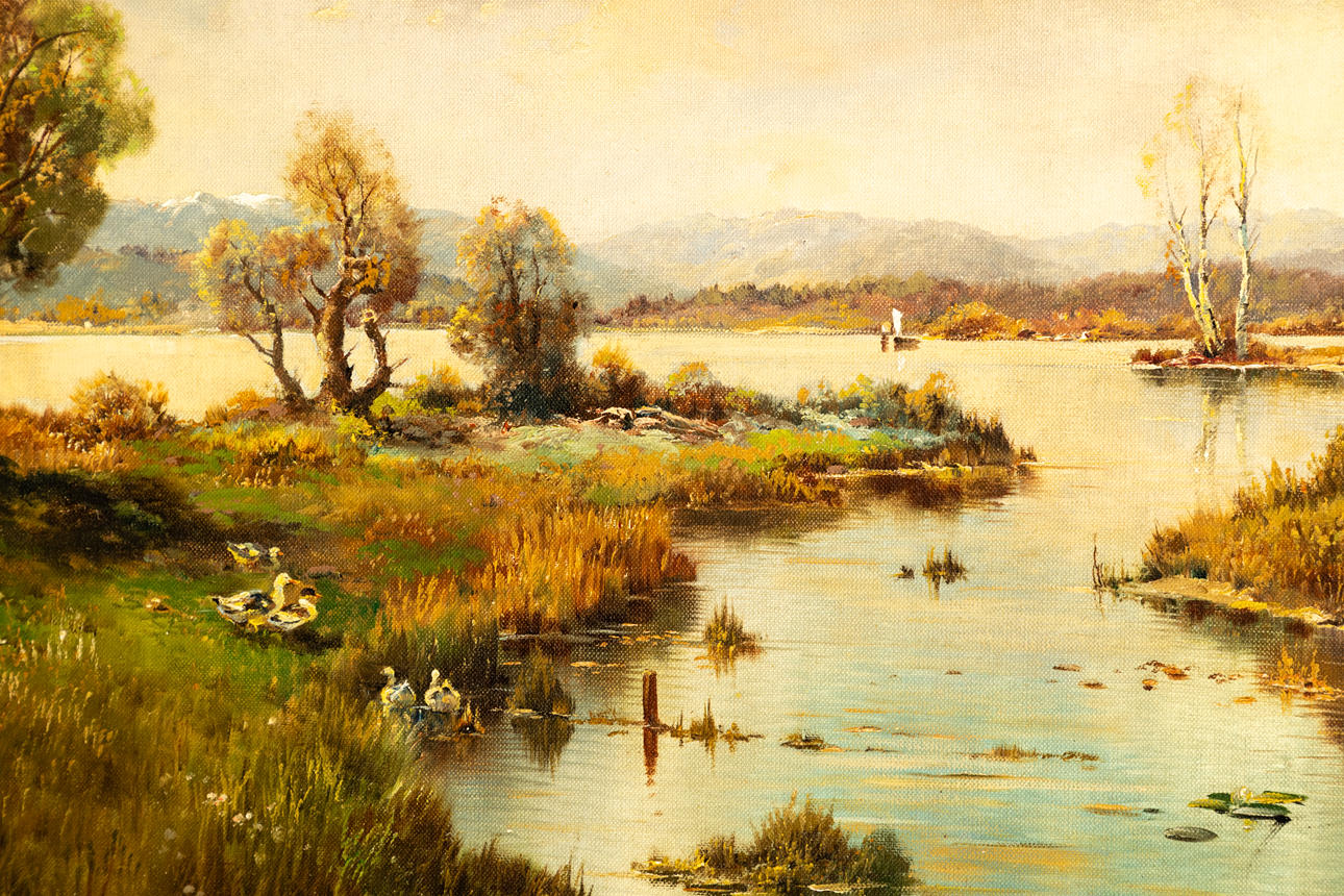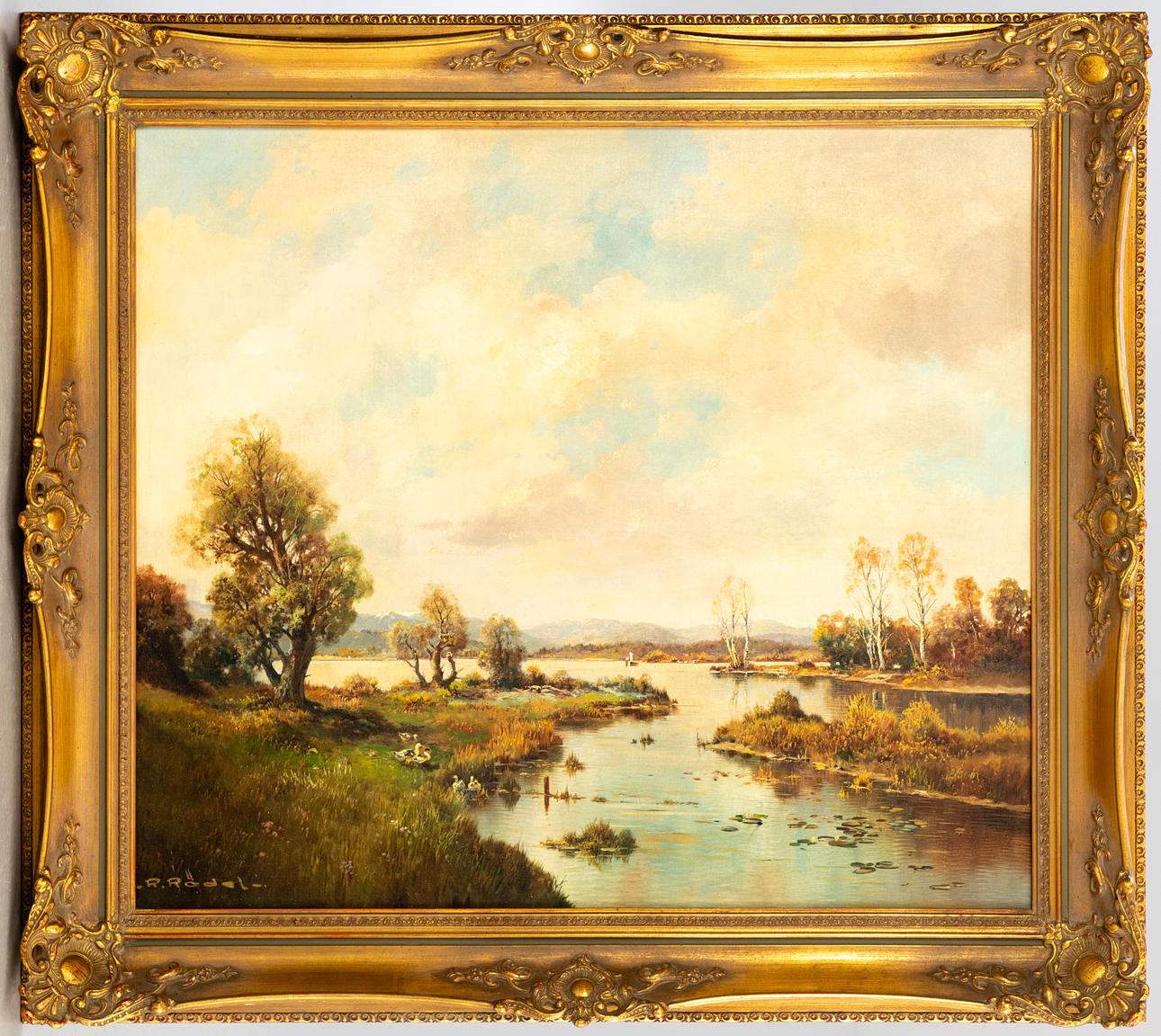 Rudolf Rödel (1914-?), Waginger See, Öl auf Leinwand, signiert, rückseitig auf dem Keilrahmen (von fremder Hand?) betitelt und bezeichnet, ca. 71 x 80 cm, mit Rahmen ca. 89 x 100 cm.